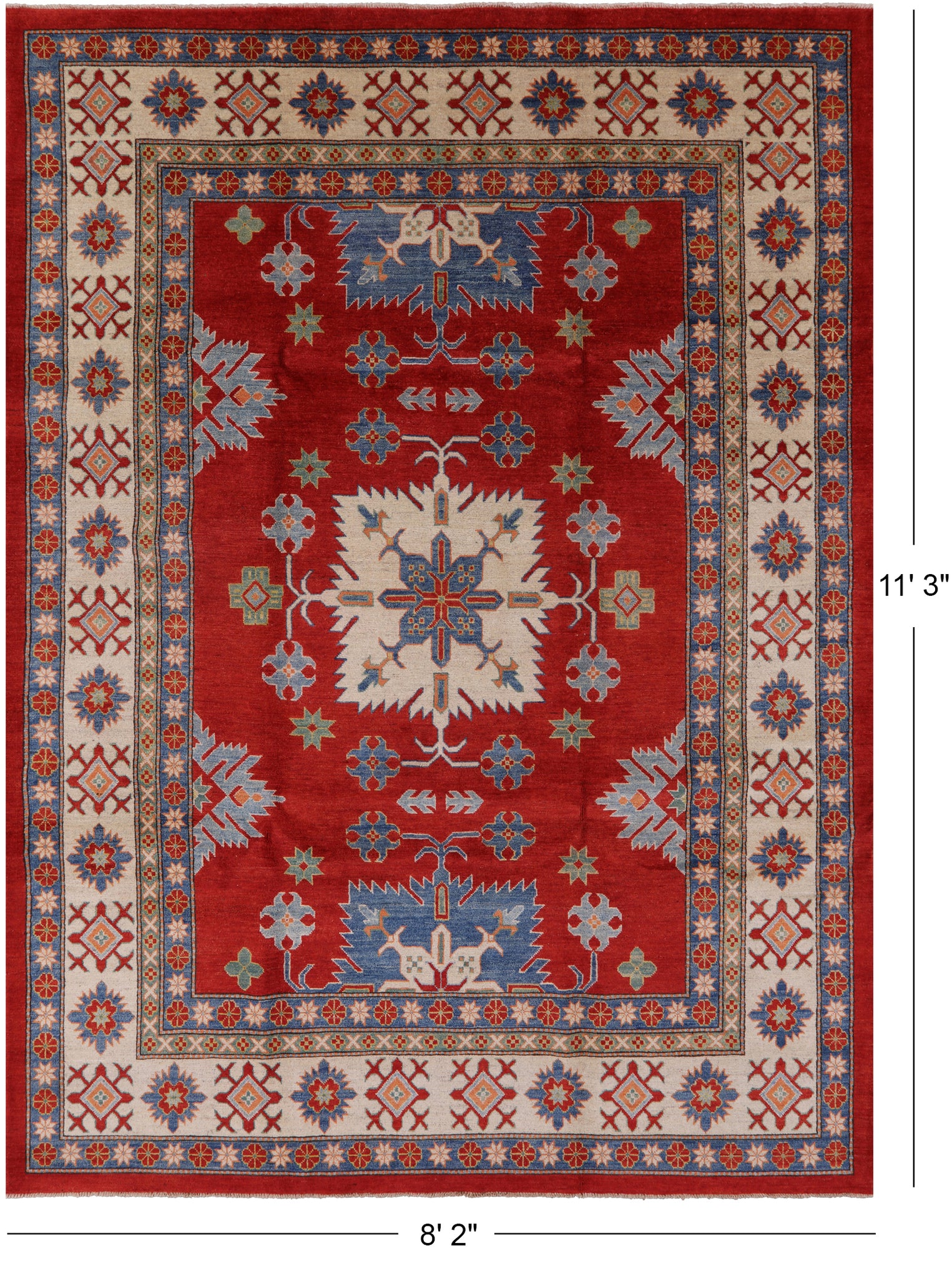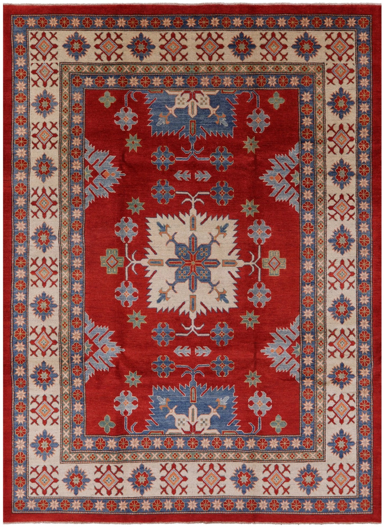 Kazak Rugs are popular for their stunning geometric designs & high quality dyes. Kazak patterns tend to be red, yellow/gold and blue. Designs include, but are not limited to animals, flowers, medallions, & iconic figures such as geometric people/ and animals & symbolic motifs.Β