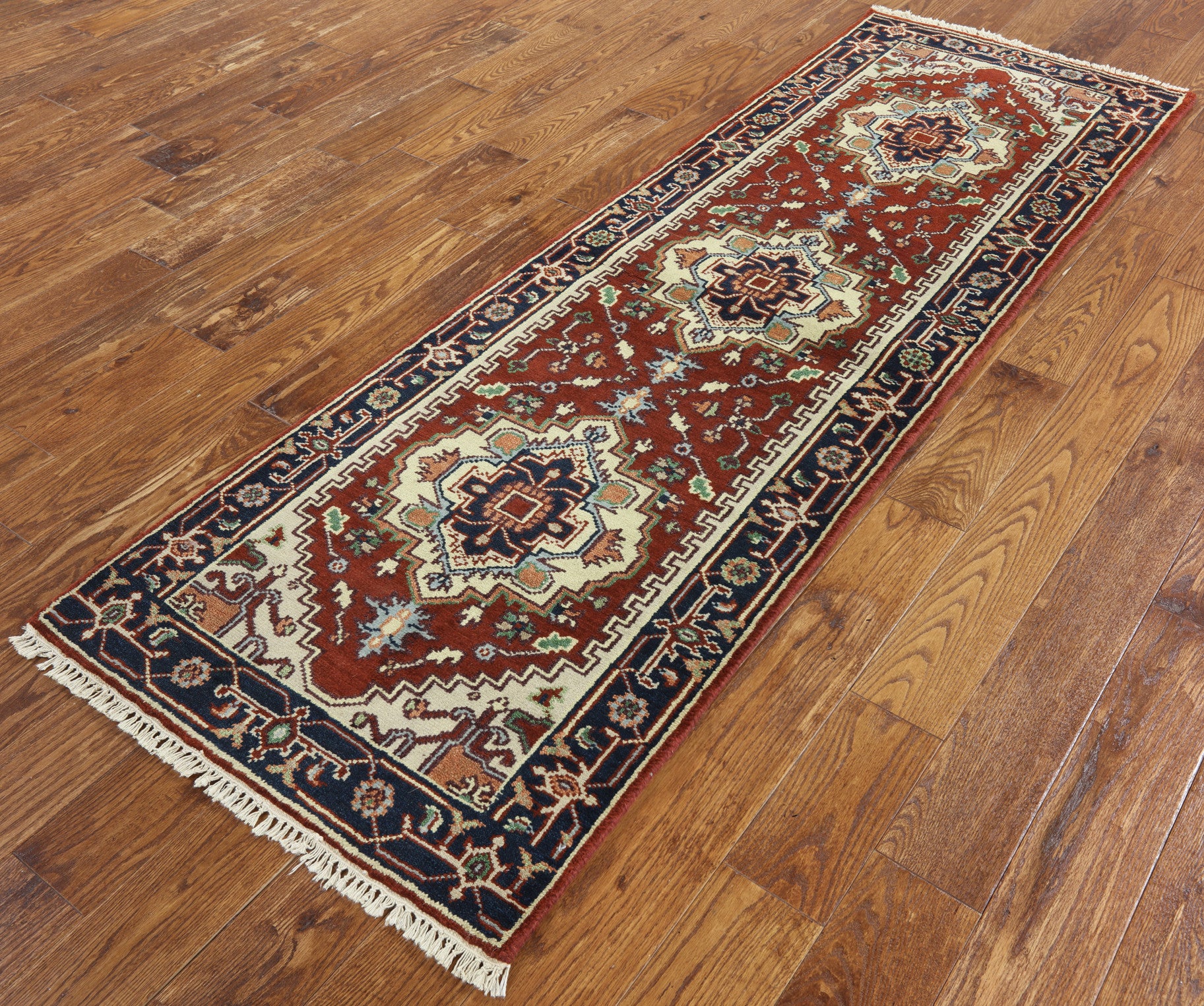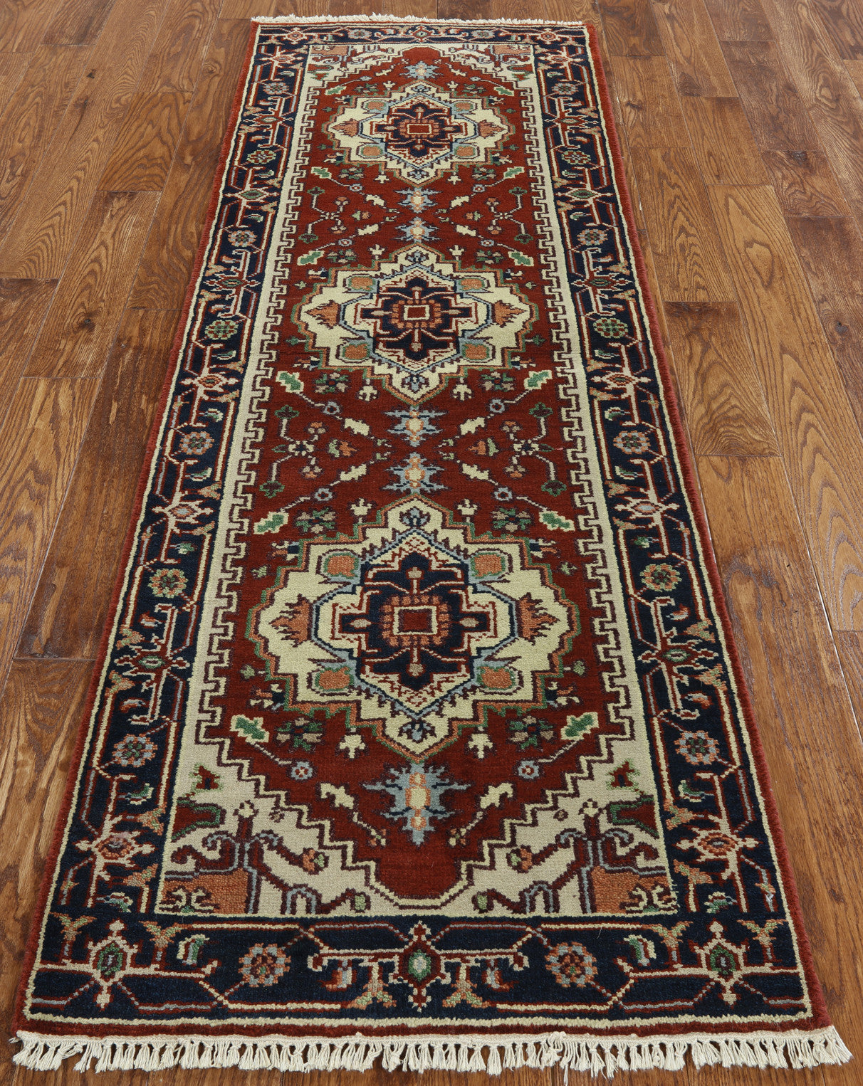 Heriz/Serapi Rugs are hand-knotted with a thick, heavy pile and a rich color palette. Most designs are large geometric medallions or an all over highly stylized floral motif design. Serapiโ€™s are made with pure natural vegetable dyes, hand-spun wool, graphic designs and inspired artistry. Traditional Heriz colors are red, black, blues, & ivory.