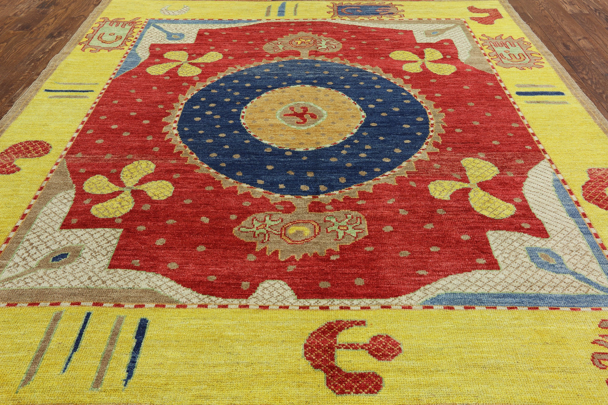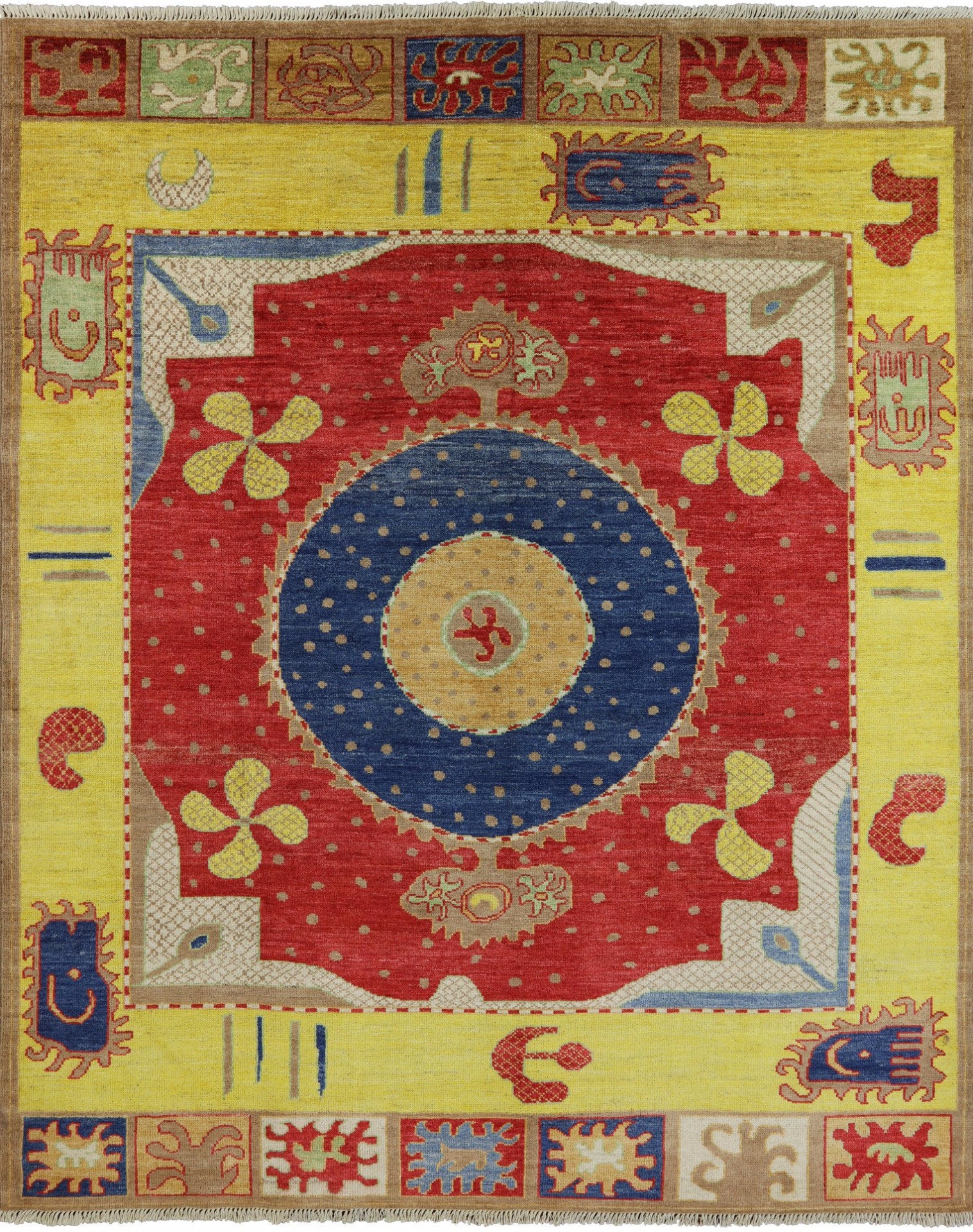 Art deco rugs are designed with both medallion as well as all-over designs. Colors are vibrant & energetic. Rich tones of magenta, turquoise, emerald, ruby and violet are common. Art Deco carpets are woven with pile & sometimes flat woven without pile, using various materials such as silk, wool, and cotton.