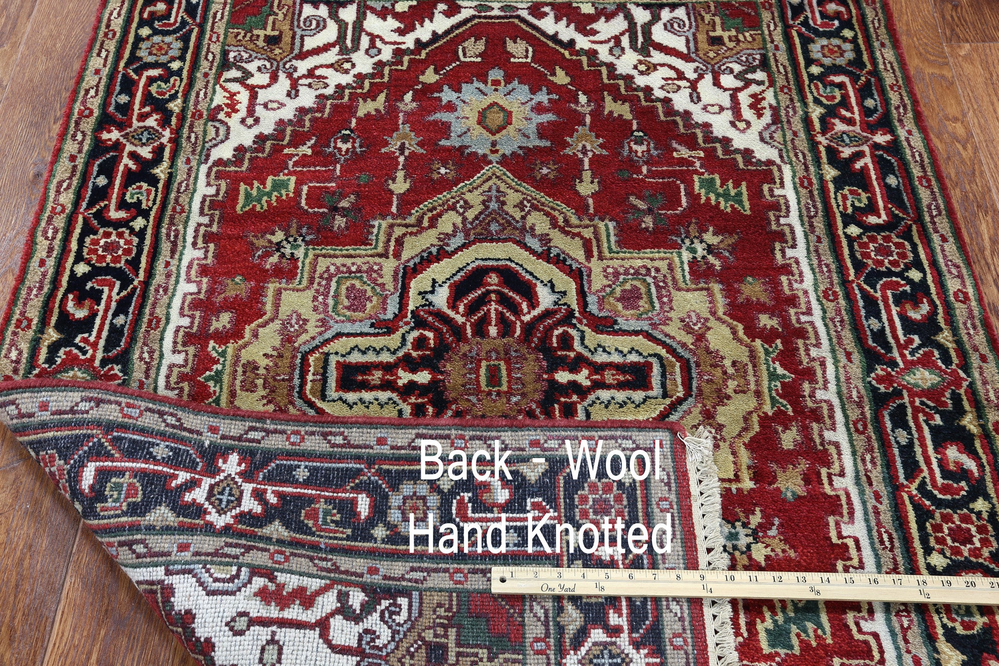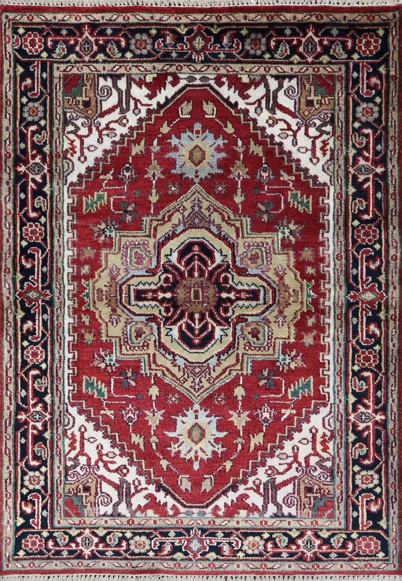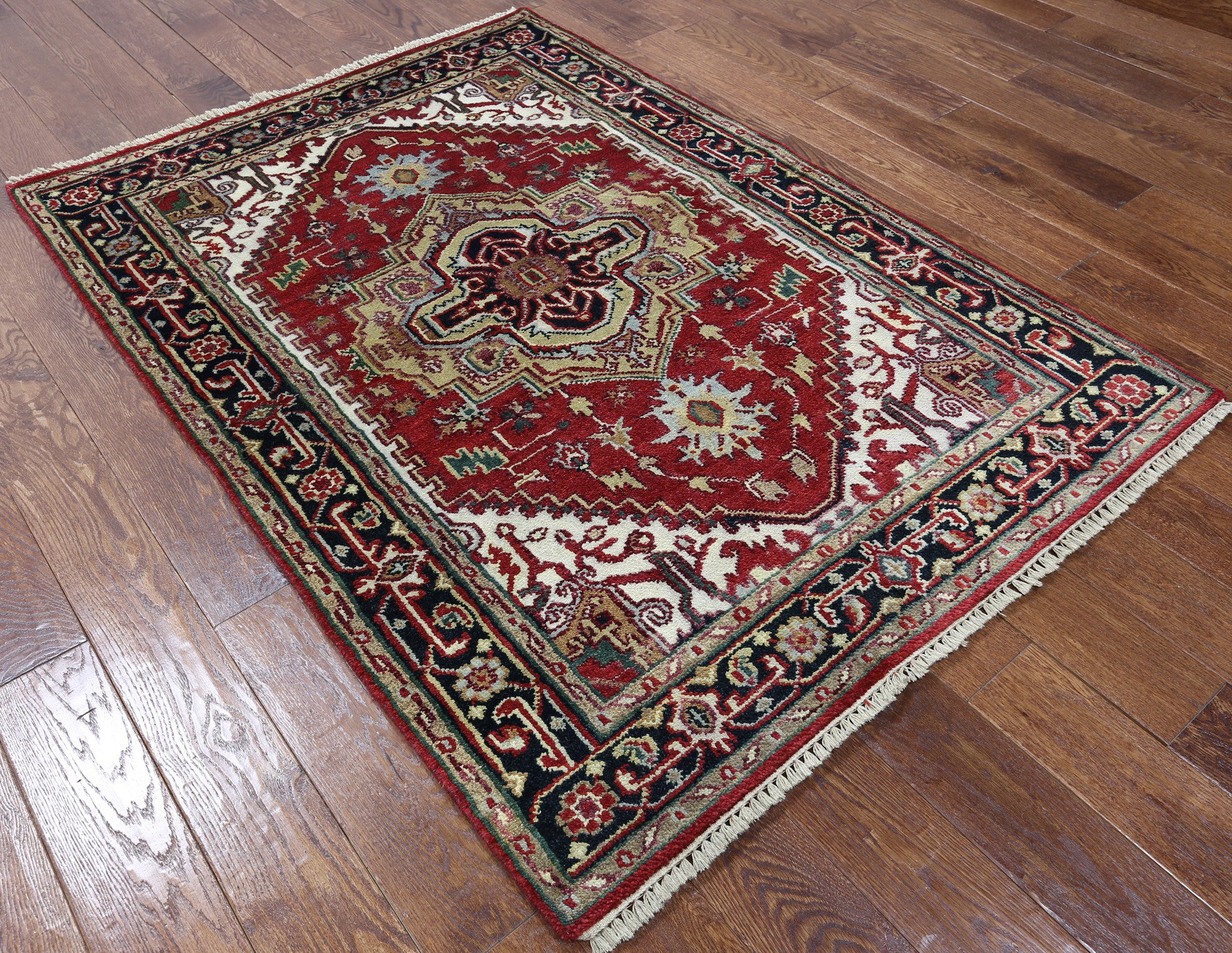 Heriz/Serapi Rugs are hand-knotted with a thick, heavy pile and a rich color palette. Most designs are large geometric medallions or an all over highly stylized floral motif design. Serapi’s are made with pure natural vegetable dyes, hand-spun wool, graphic designs and inspired artistry. Traditional Heriz colors are red, black, blues, & ivory.