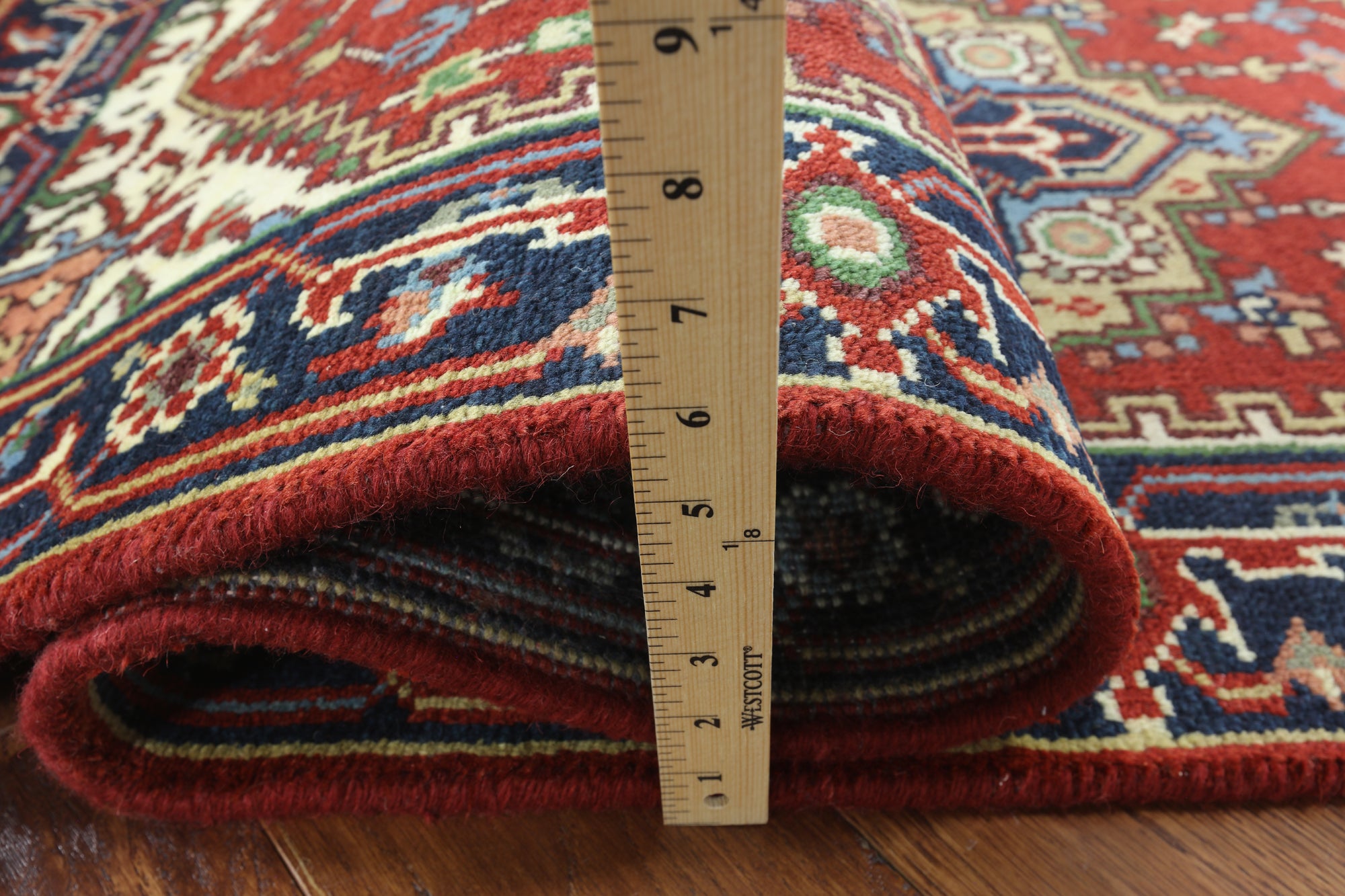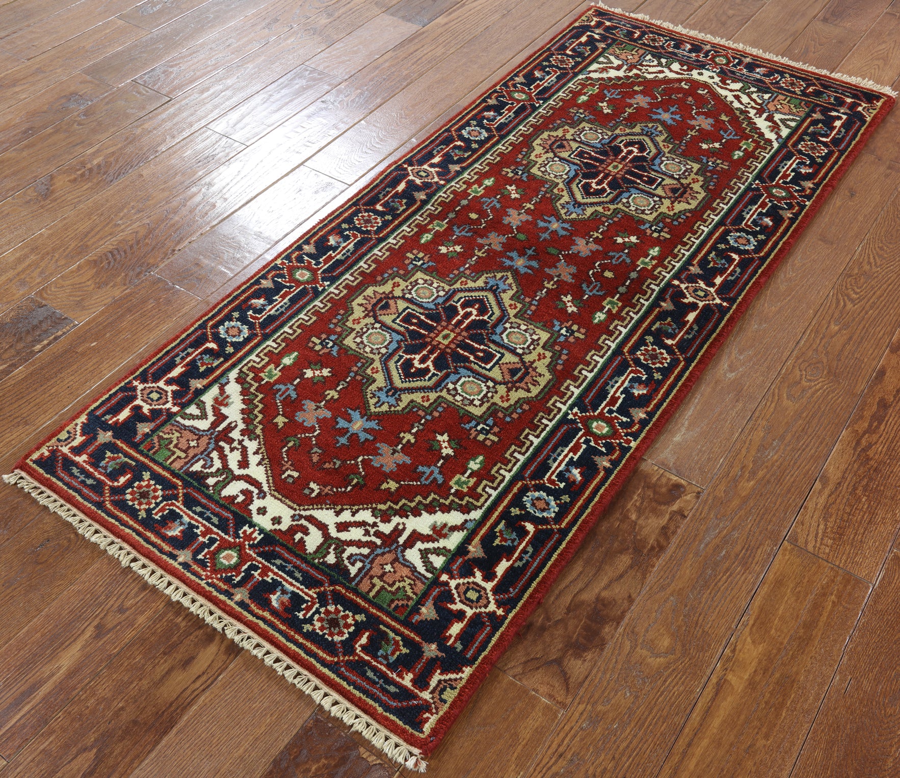 Heriz/Serapi Rugs are hand-knotted with a thick, heavy pile and a rich color palette. Most designs are large geometric medallions or an all over highly stylized floral motif design. Serapi’s are made with pure natural vegetable dyes, hand-spun wool, graphic designs and inspired artistry. Traditional Heriz colors are red, black, blues, & ivory.