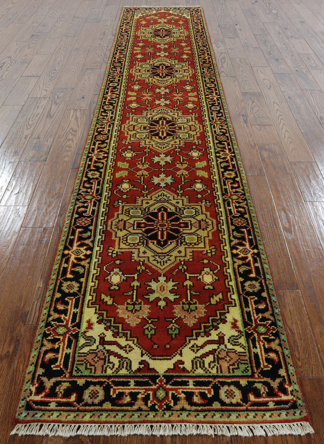 Heriz/Serapi Rugs are hand-knotted with a thick, heavy pile and a rich color palette. Most designs are large geometric medallions or an all over highly stylized floral motif design. Serapiโ€™s are made with pure natural vegetable dyes, hand-spun wool, graphic designs and inspired artistry. Traditional Heriz colors are red, black, blues, & ivory.