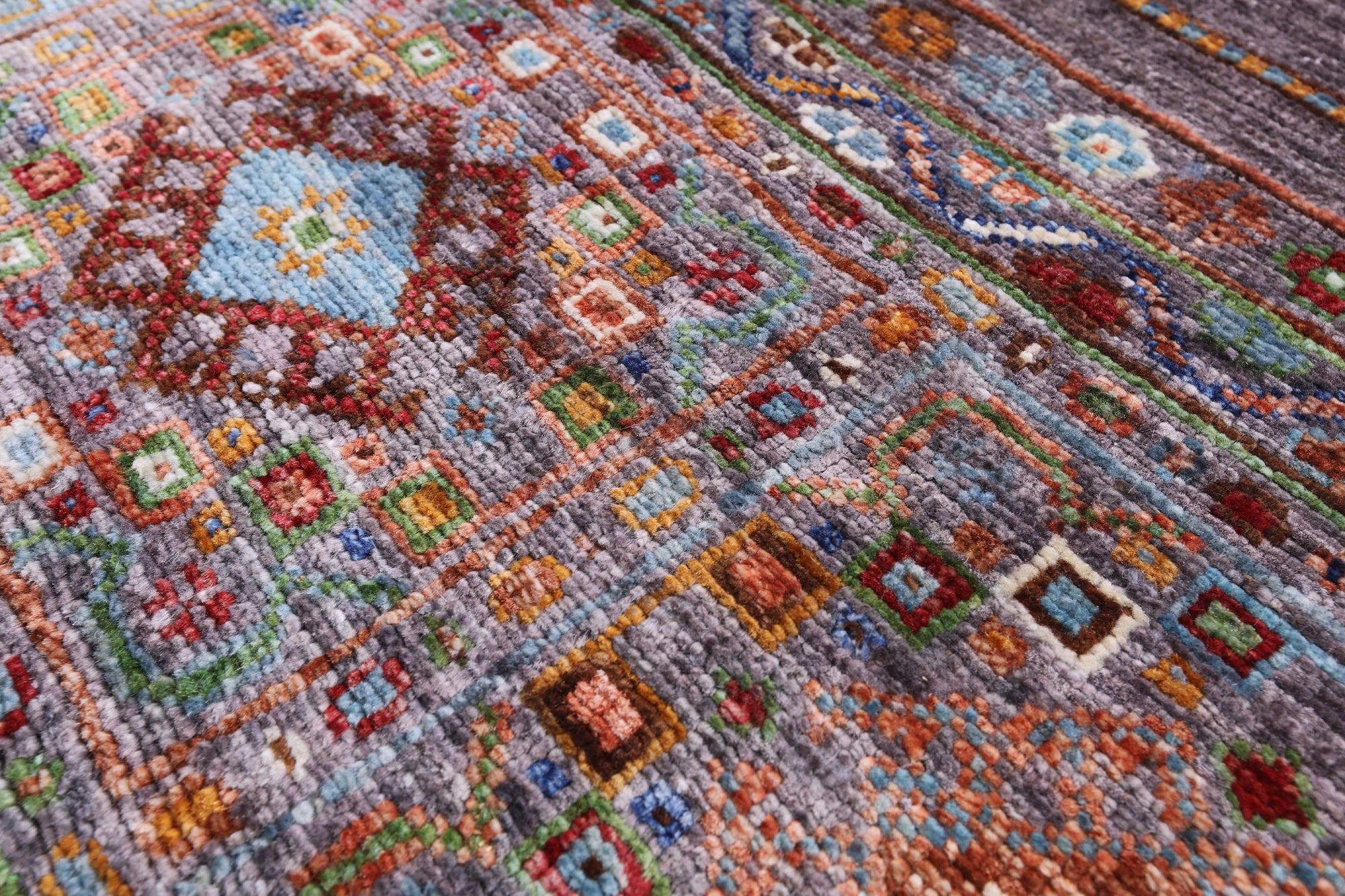 Gabbeh Rugs originate from South-Central Iran, and feature hand-spun wool in both the pile and foundation as well as all natural dyes. Gabbeh patterns are very basic, mostly consisting of colorful rectangular objects resembling animals, or people, abstract scenery used to tell a story, depict a person or place. They contain soft lustrous wool, and emphasizes color on design detail. These Classic Persian Rugs are popular in homes with contemporary & modern interior.