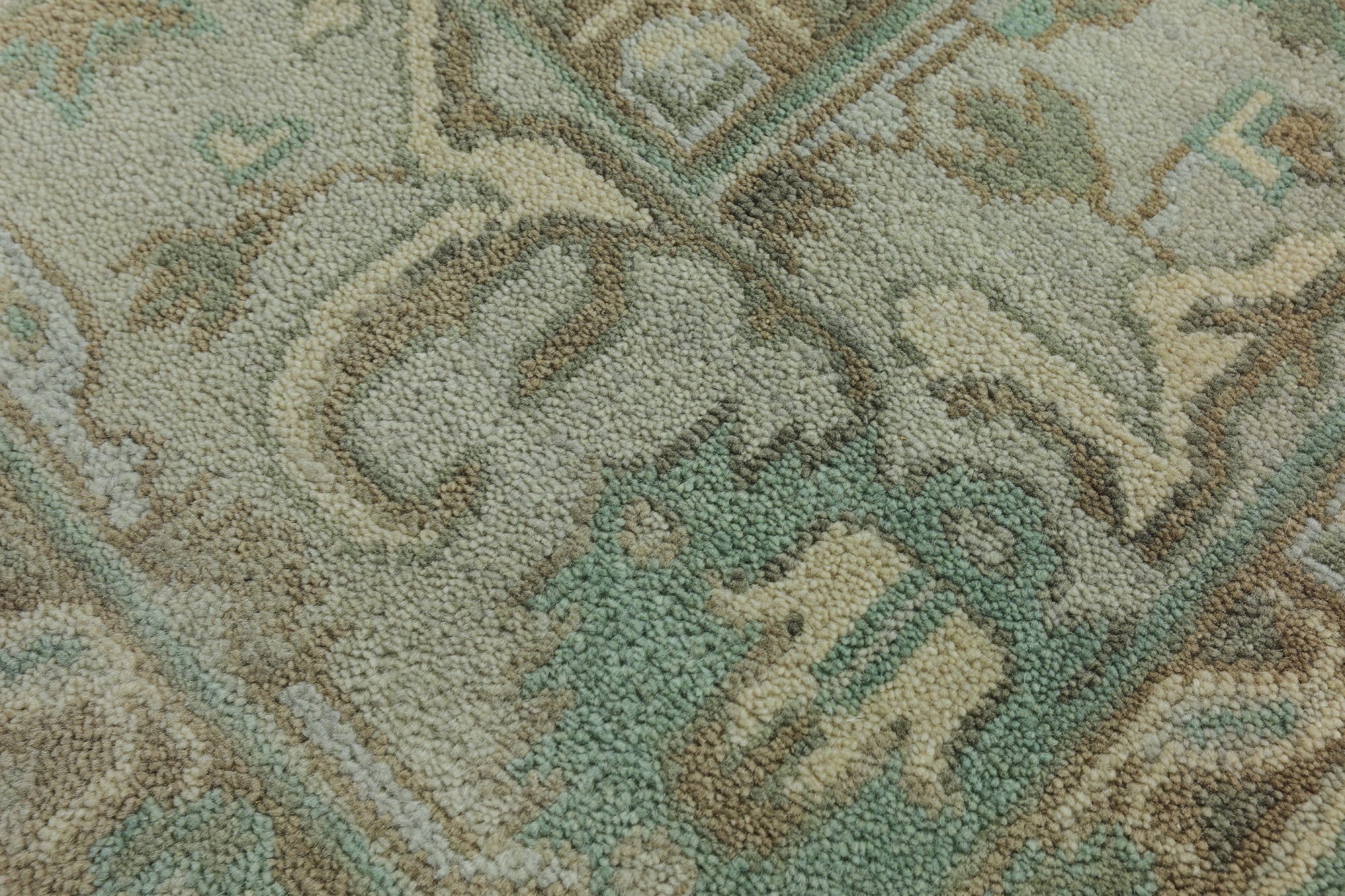 Oushak Rugs are distinctive in both pattern and color palette. Most have a blue, green, dark ivory, or gold & their designs are typically based on geometric motifs and vine / leave motifs. All colors are created with natural vegetable dyes, and the hushed tones are enhanced by the soft, lustrous wool texture. The foundation of an Oushak is cotton while the pile is wool. Oushak rugs are also double-knotted for durability.