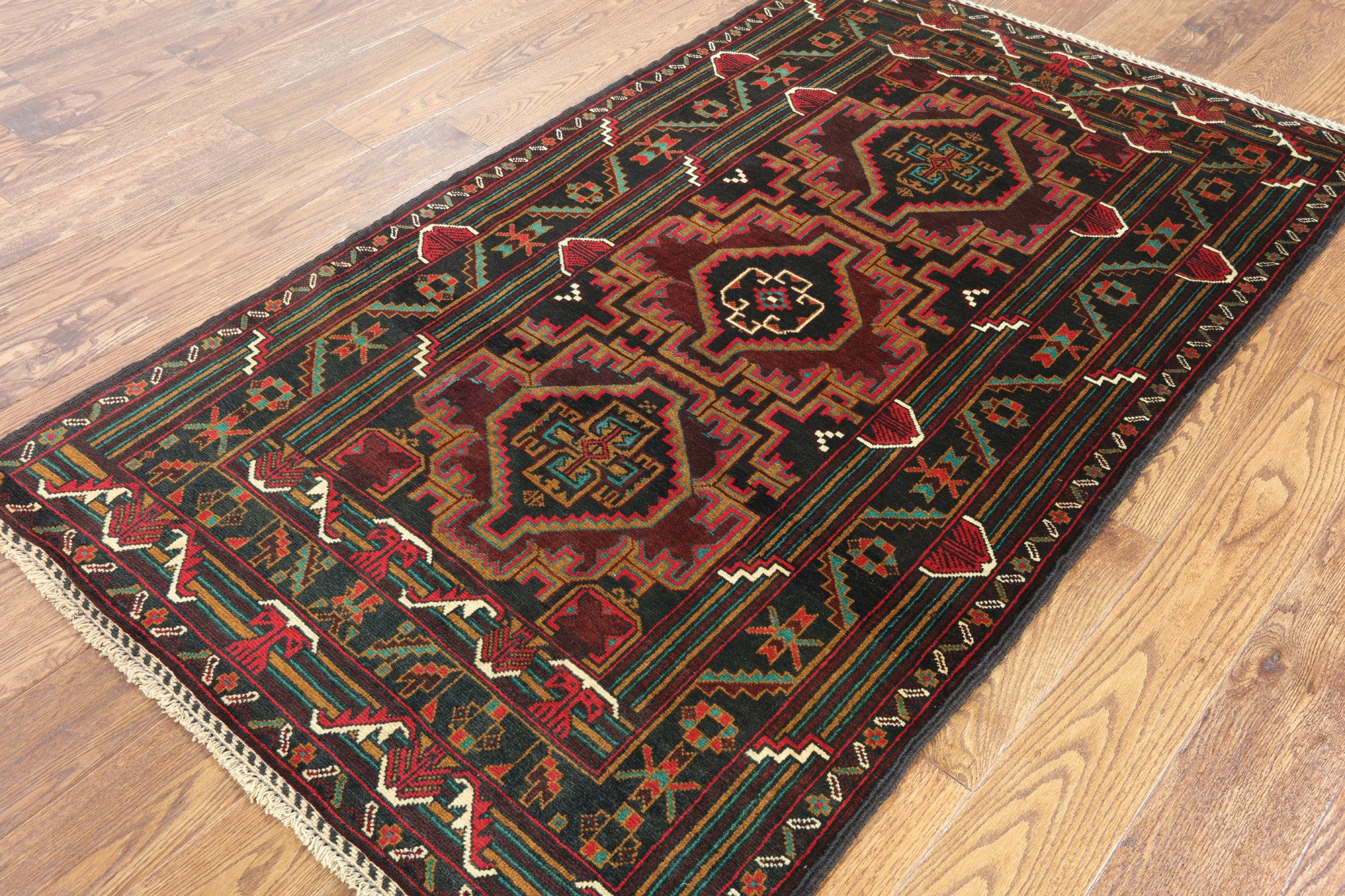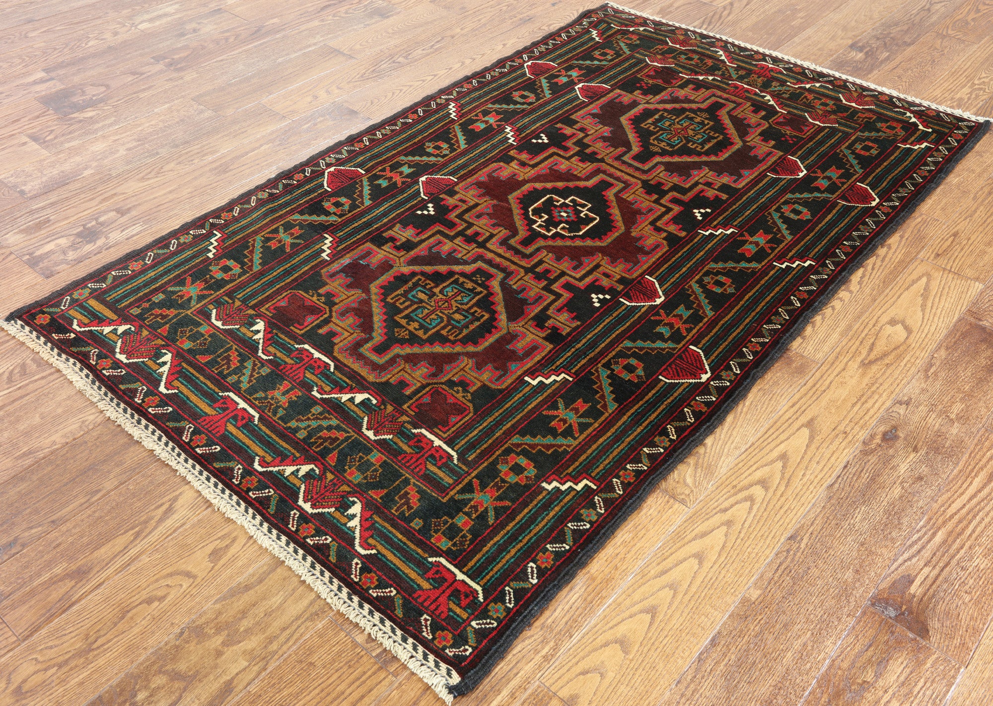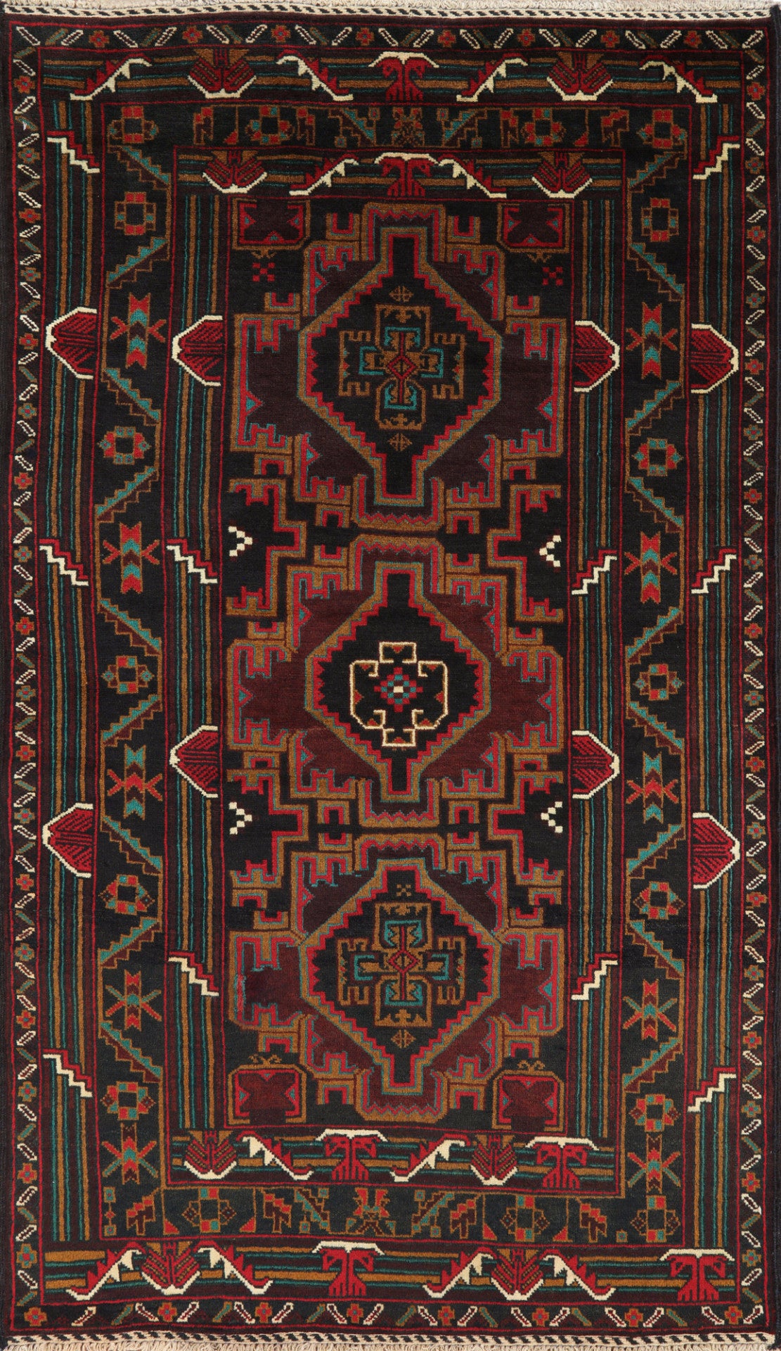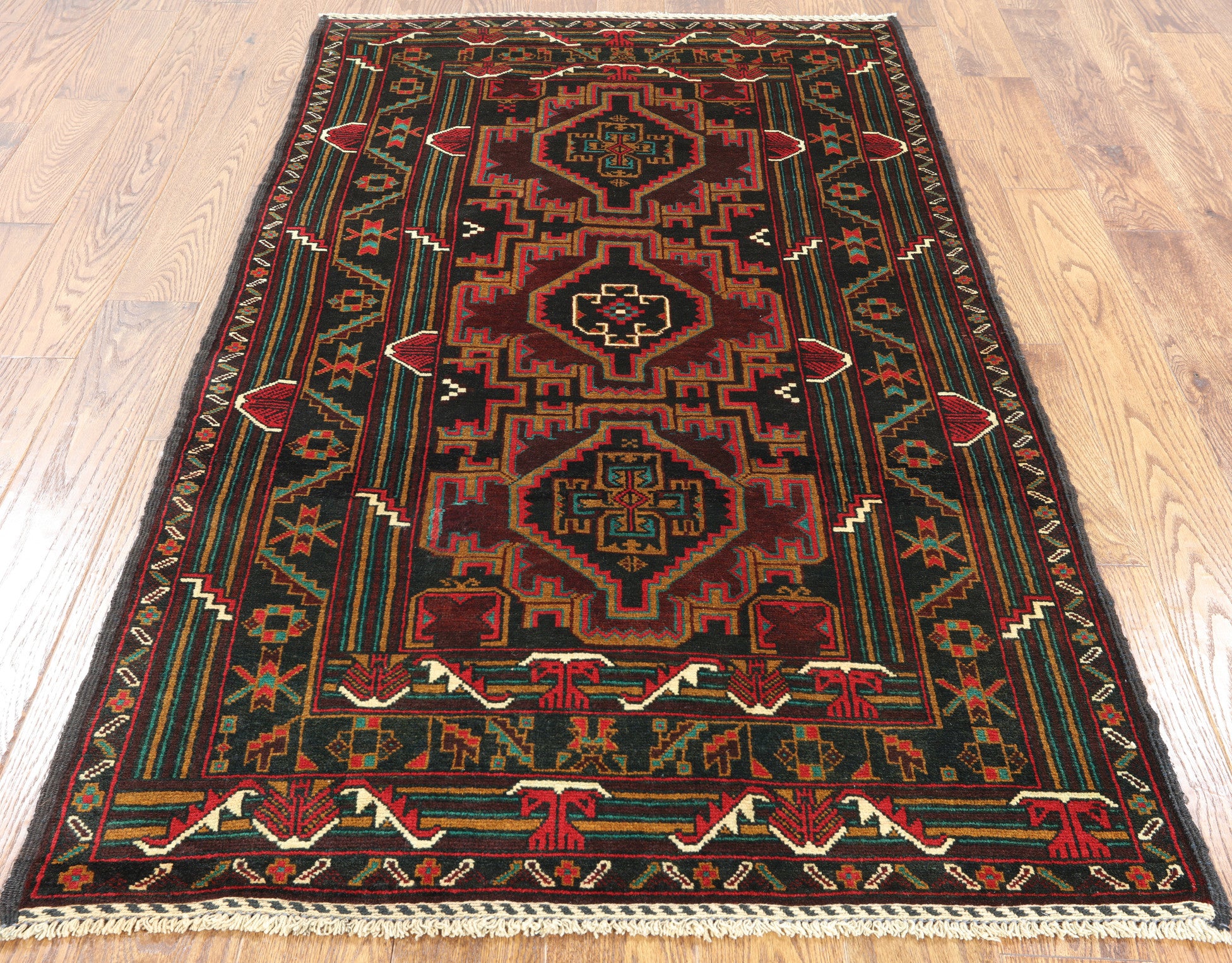 Baluch (Balouch) rugs are unique because there are no duplicates. Each rug differs in design, either Tribal, repeated Camel print or Gul medallions. Baluch rugs are soft & flexible and each contains a form of history that is used to express and follow ancient Persian tradition. Baluch colors are predominately burgundy with a navy blue, black, brown, rust, and red, with occasional sites of yellow, orange, green & white for outlining.