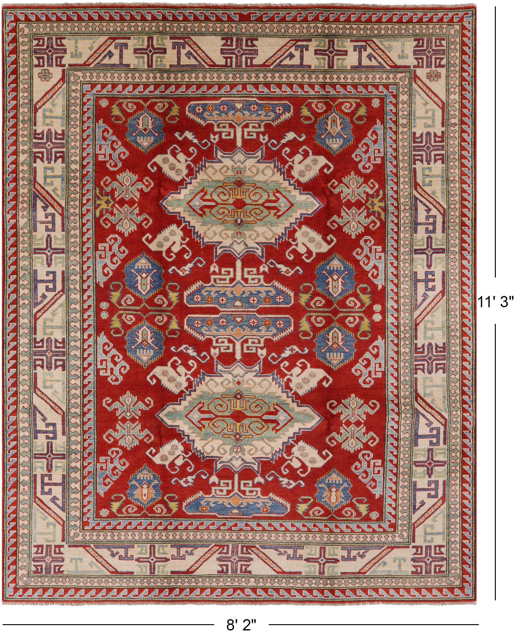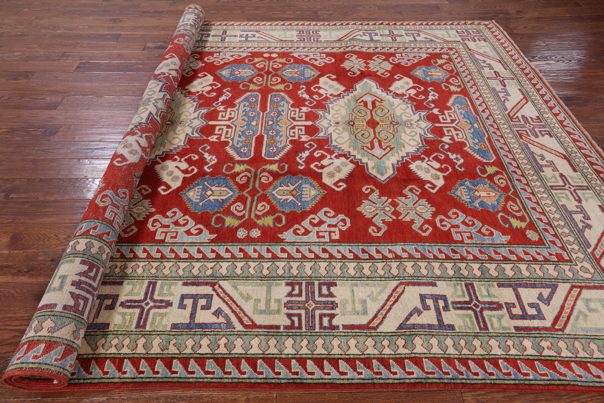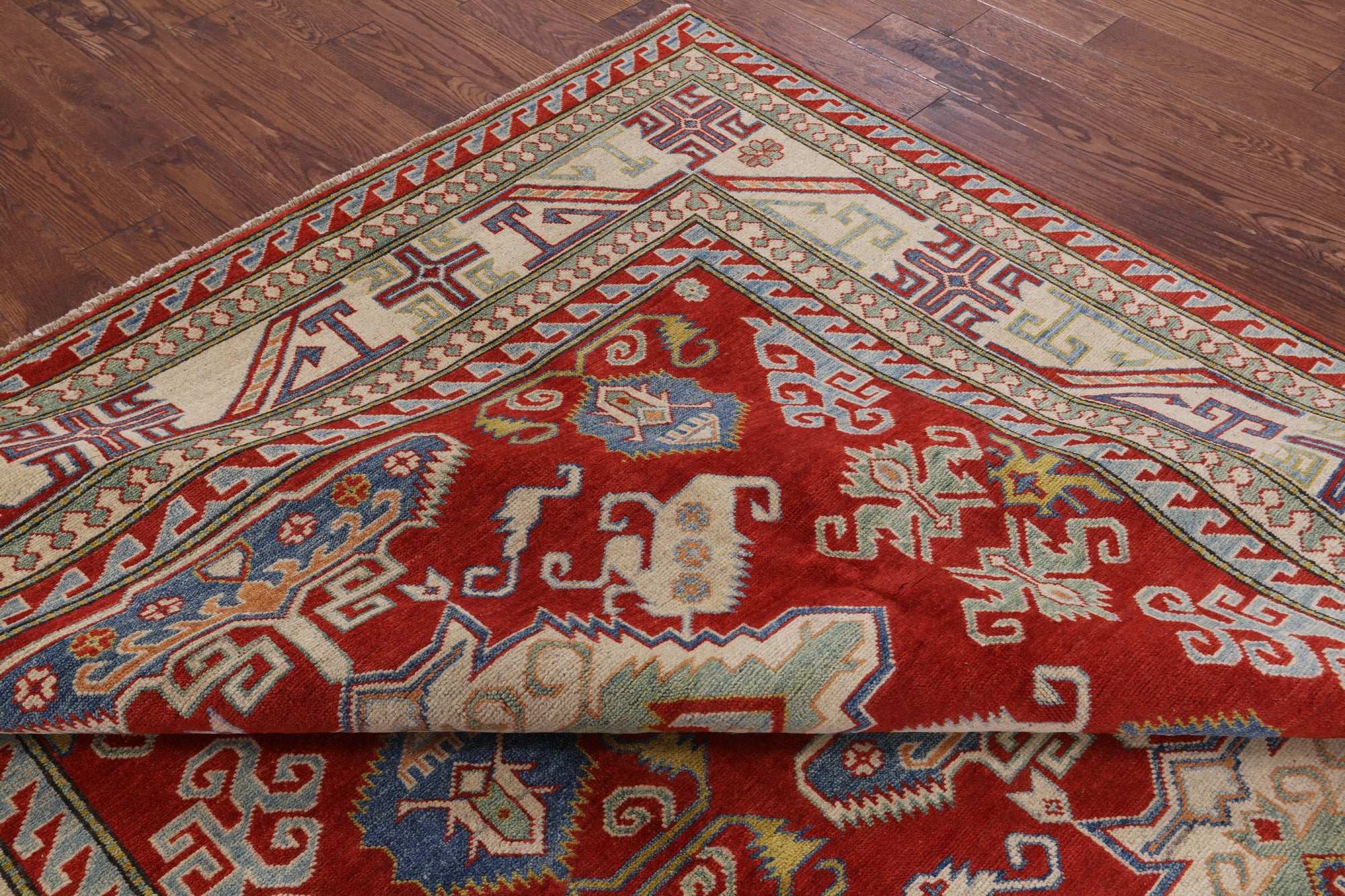 Kazak Rugs are popular for their stunning geometric designs & high quality dyes. Kazak patterns tend to be red, yellow/gold and blue. Designs include, but are not limited to animals, flowers, medallions, & iconic figures such as geometric people/ and animals & symbolic motifs.Β