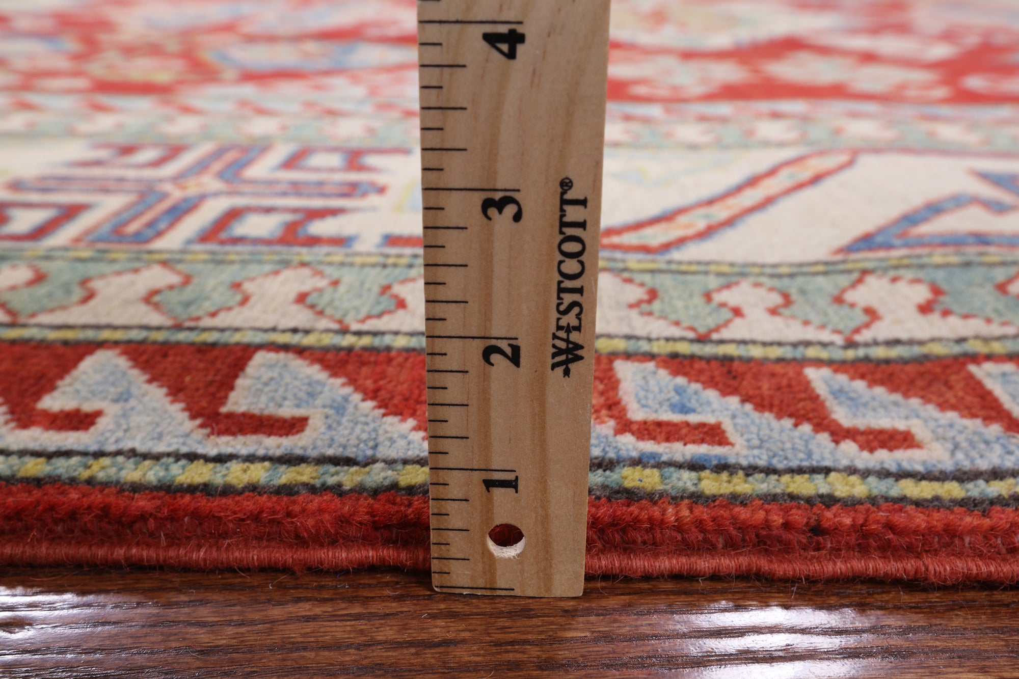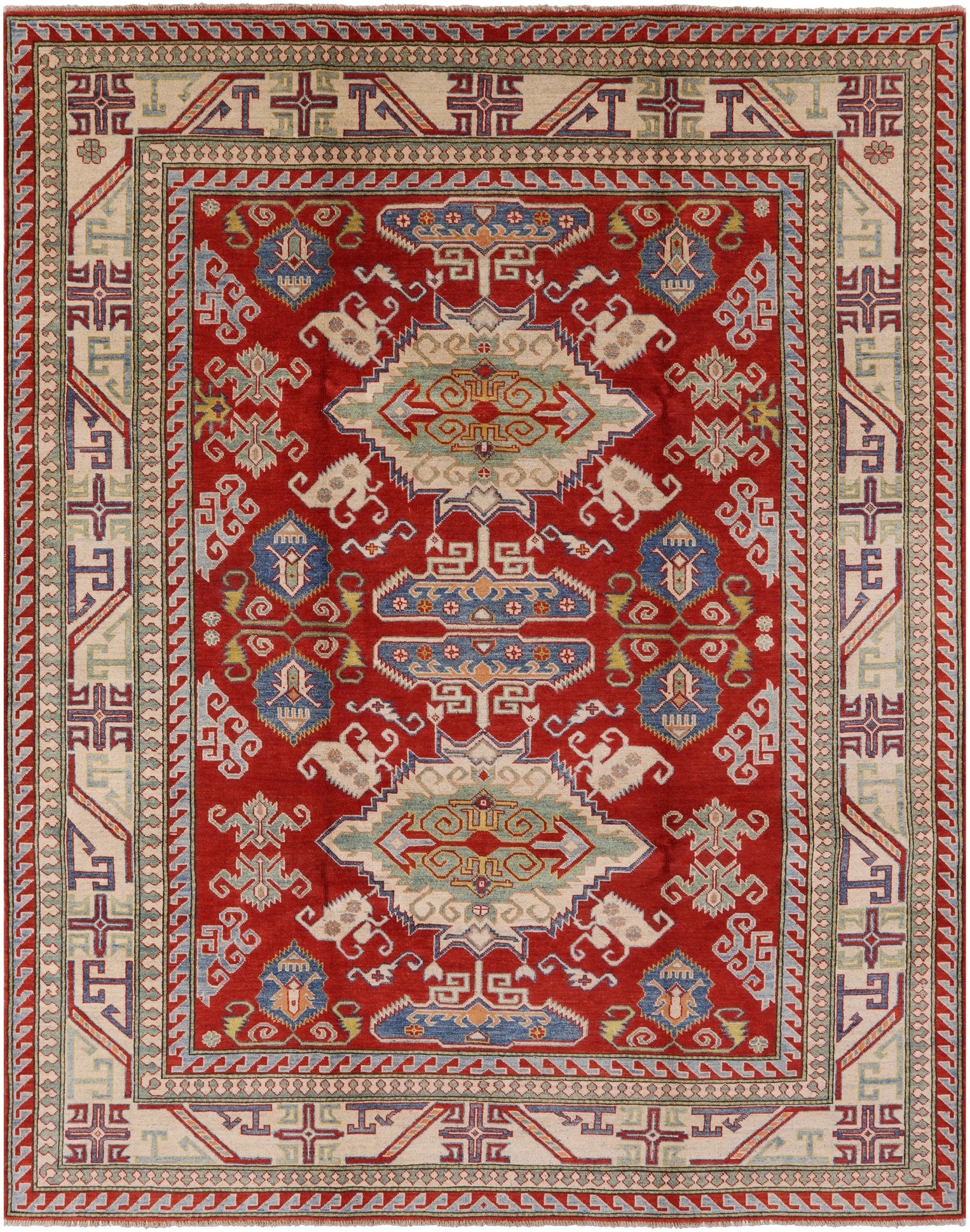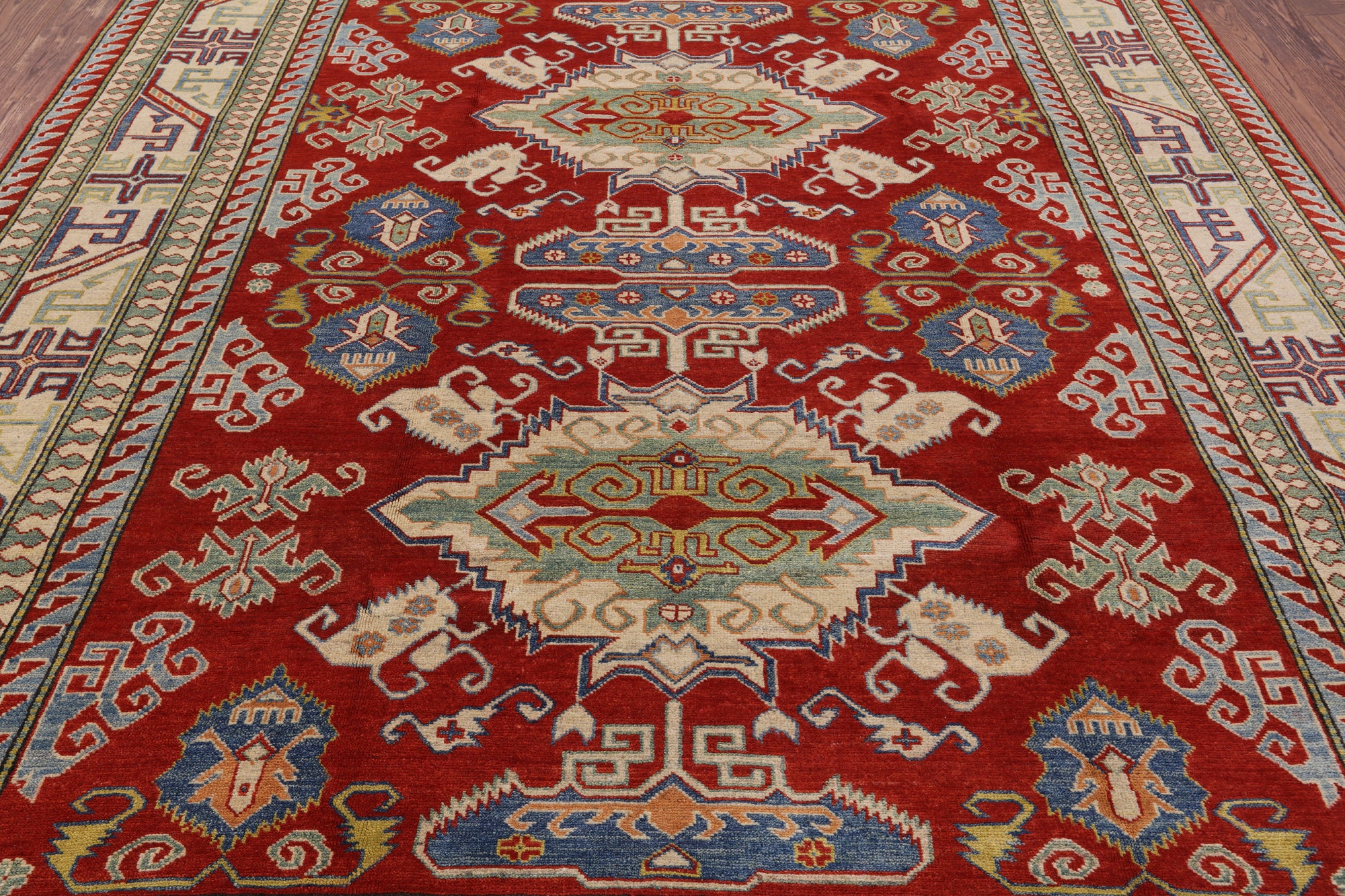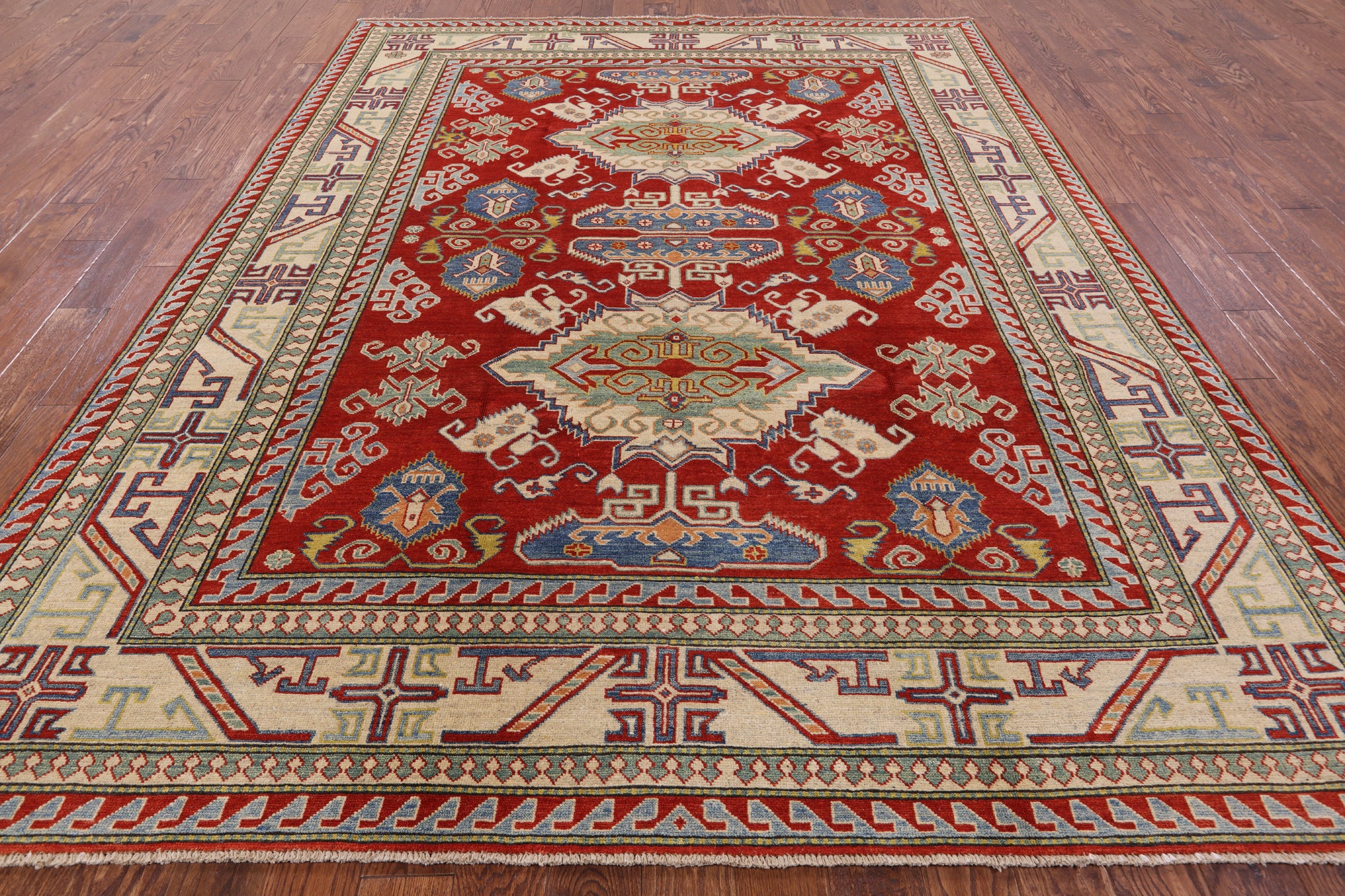 Kazak Rugs are popular for their stunning geometric designs & high quality dyes. Kazak patterns tend to be red, yellow/gold and blue. Designs include, but are not limited to animals, flowers, medallions, & iconic figures such as geometric people/ and animals & symbolic motifs.Β