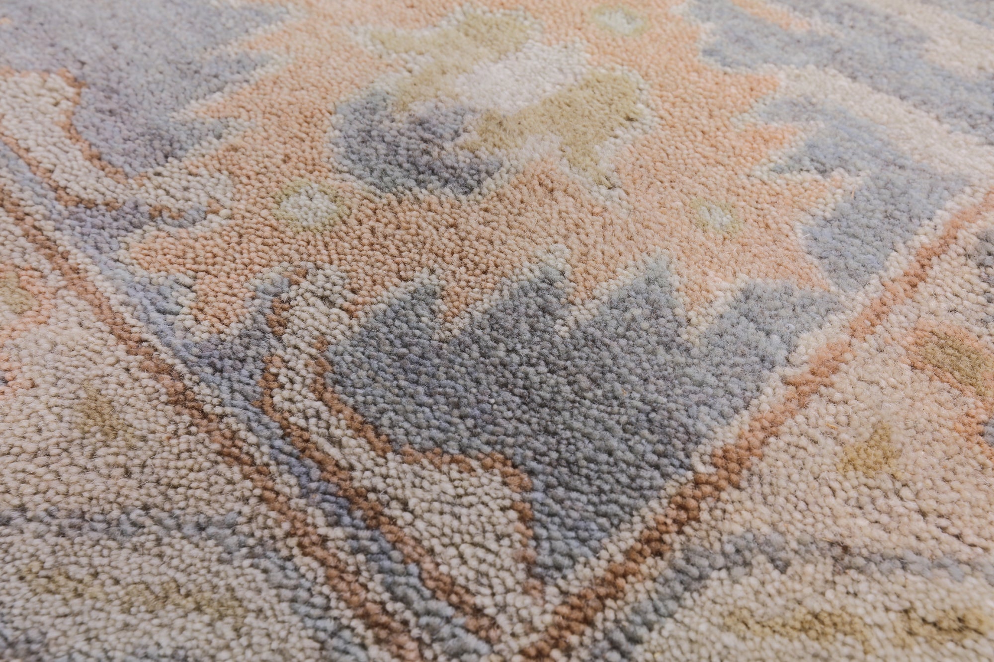 Oushak Rugs are distinctive in both pattern and color palette. Most have a blue, green, dark ivory, or gold & their designs are typically based on geometric motifs and vine / leave motifs. All colors are created with natural vegetable dyes, and the hushed tones are enhanced by the soft, lustrous wool texture. The foundation of an Oushak is cotton while the pile is wool. Oushak rugs are also double-knotted for durability.