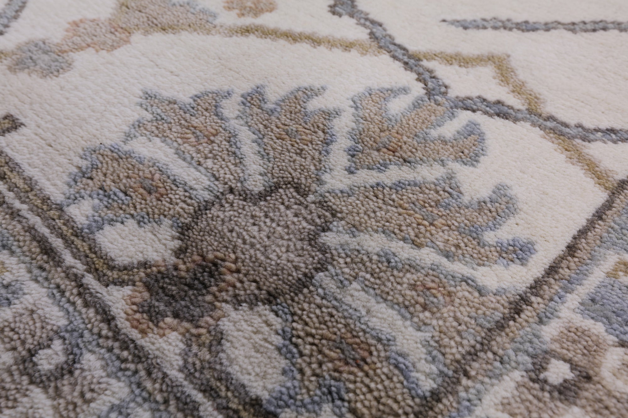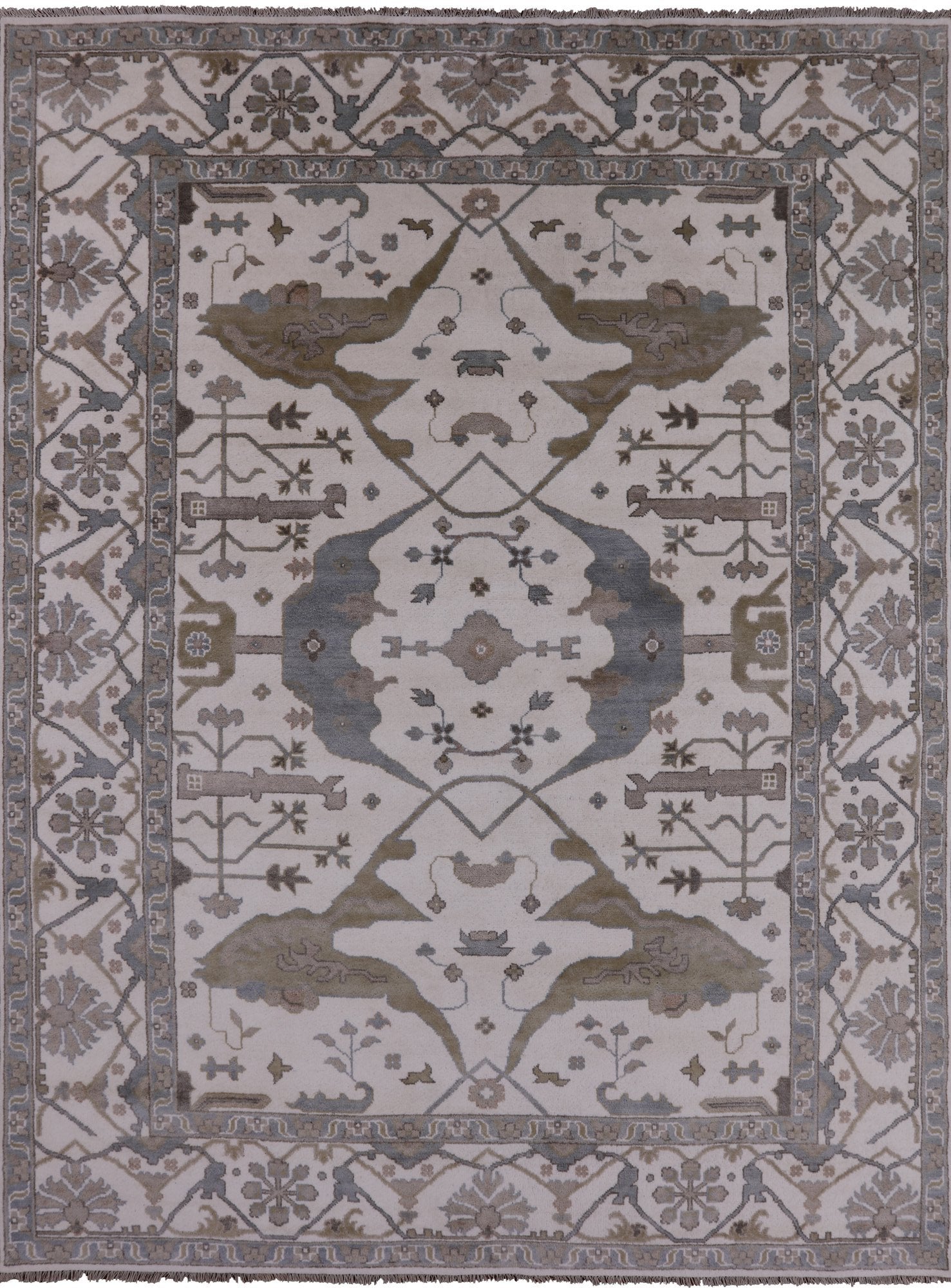 Oushak Rugs are distinctive in both pattern and color palette. Most have a blue, green, dark ivory, or gold & their designs are typically based on geometric motifs and vine / leave motifs. All colors are created with natural vegetable dyes, and the hushed tones are enhanced by the soft, lustrous wool texture. The foundation of an Oushak is cotton while the pile is wool. Oushak rugs are also double-knotted for durability.