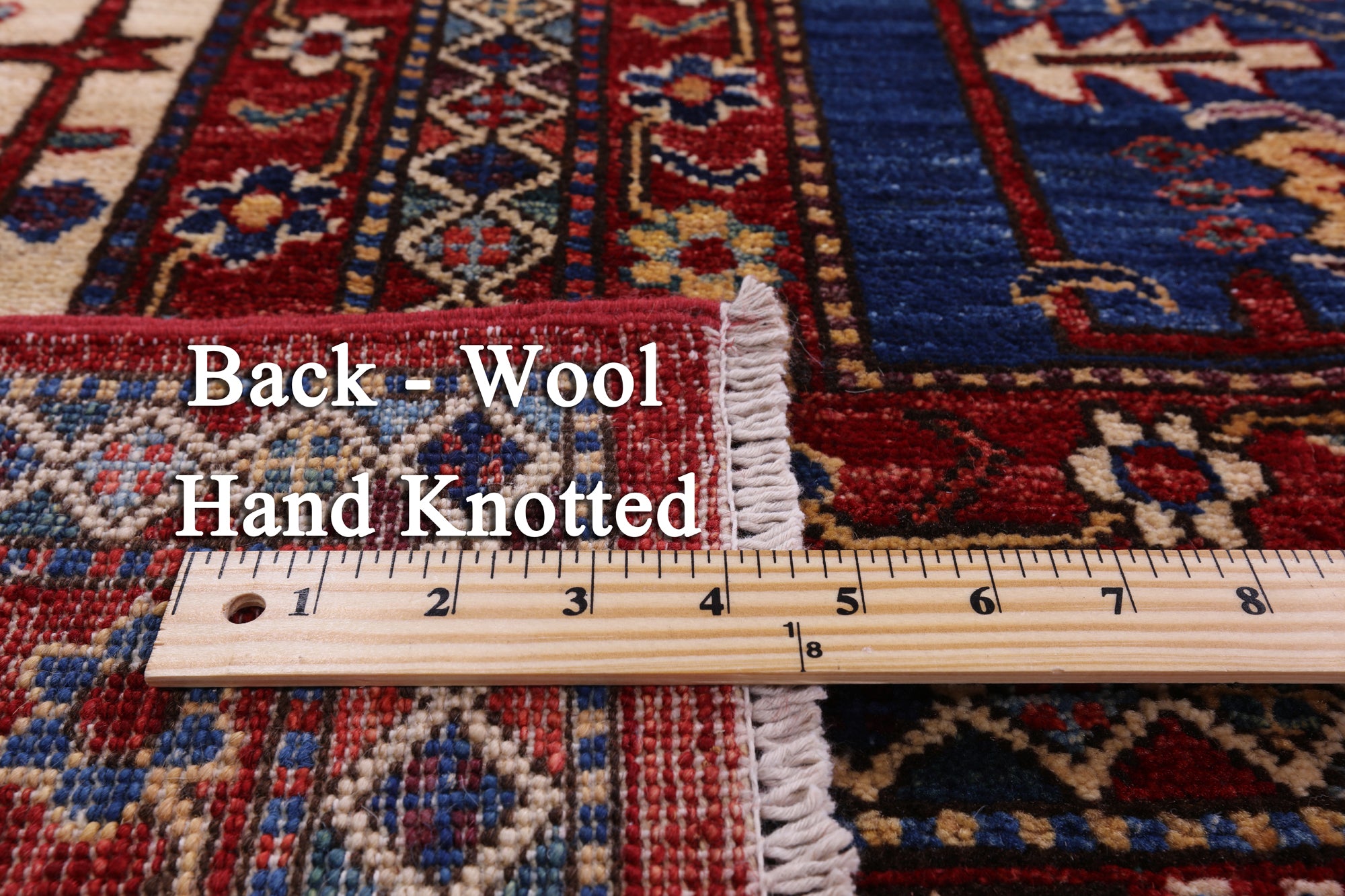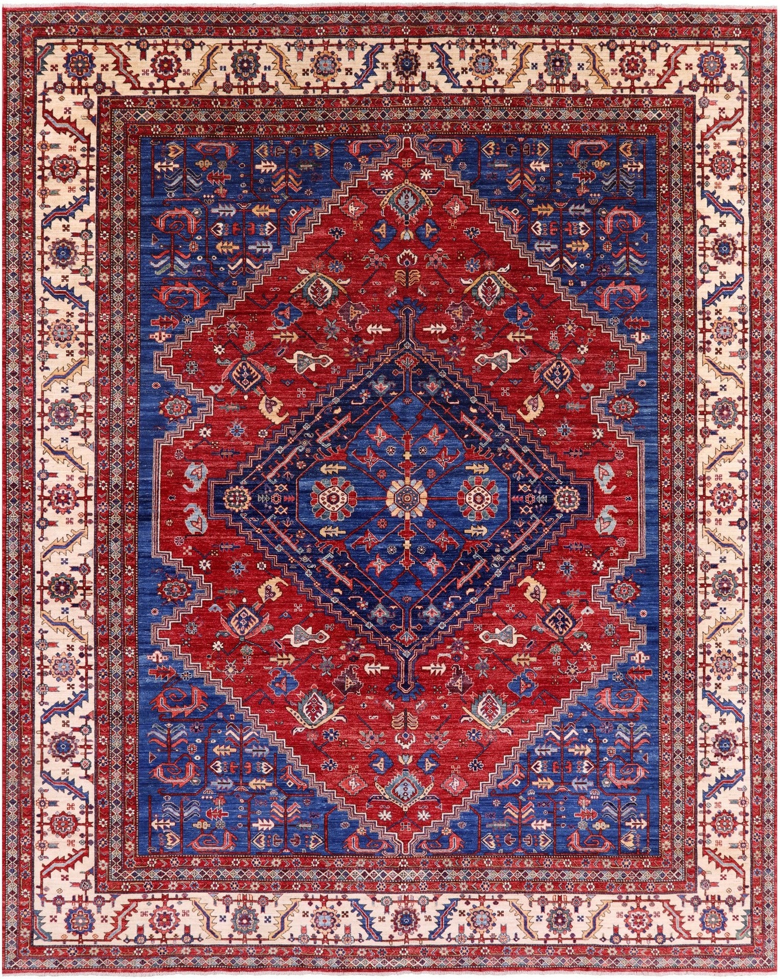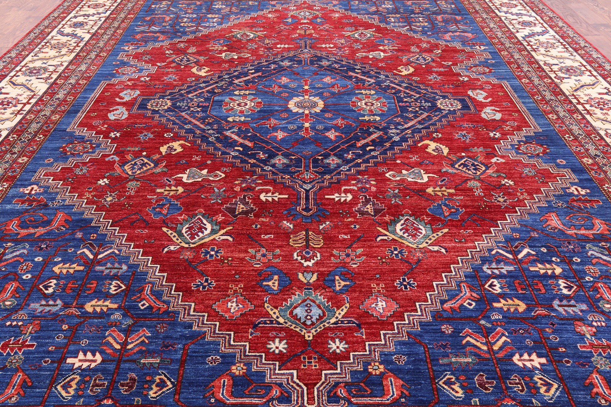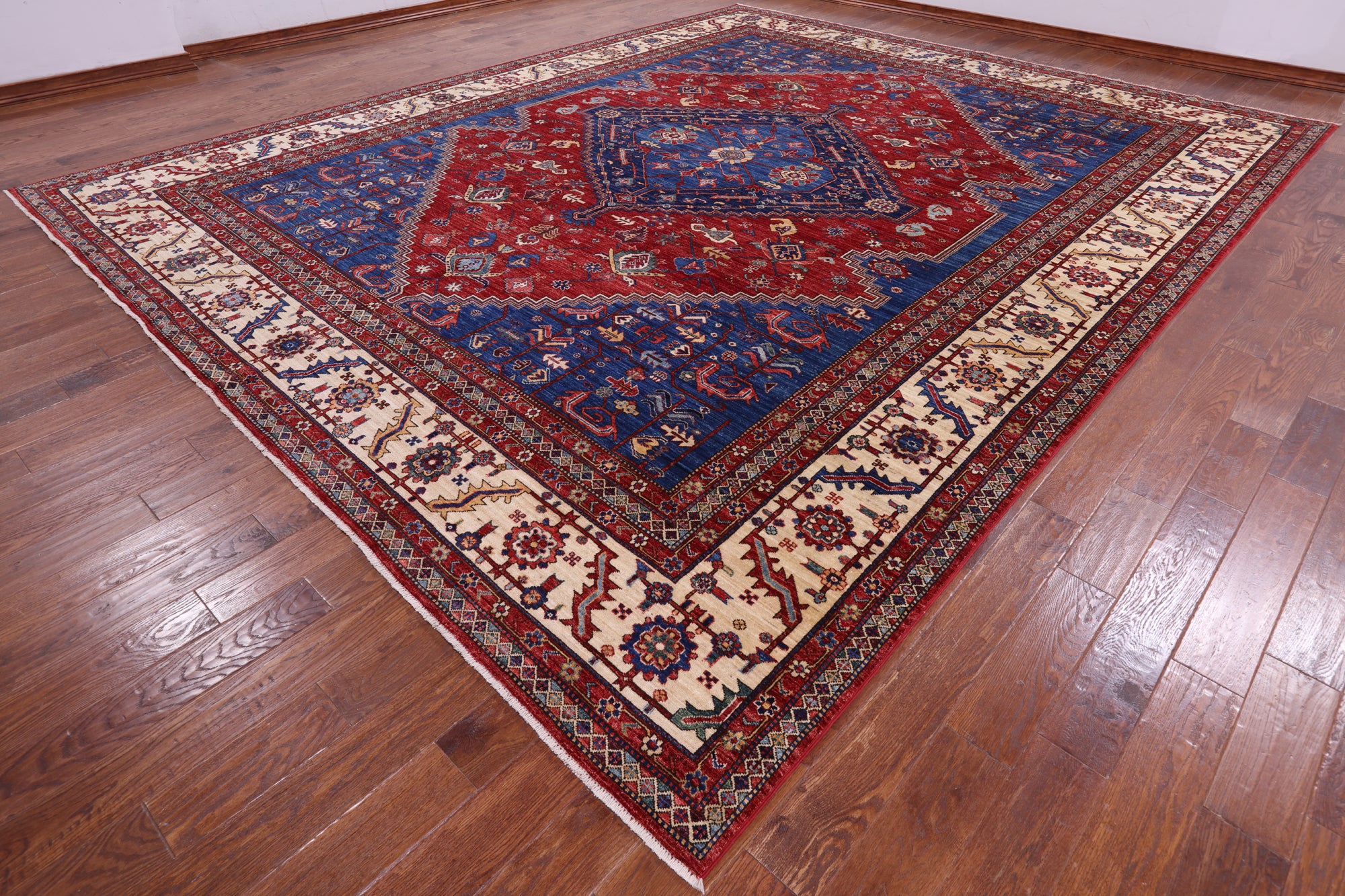 Classic Heriz/Serapi Rugs are known for their geometric figures that consist of geometric flowers, Shah Abbasi flowers, other floral elements & Islamic Arches. Its high quality texture is soft wool, the pile is thick, hand-knotted, and natural dyed. Colors used in Traditional Serapi Rugs include red, blue, ivory, black, & muted green.