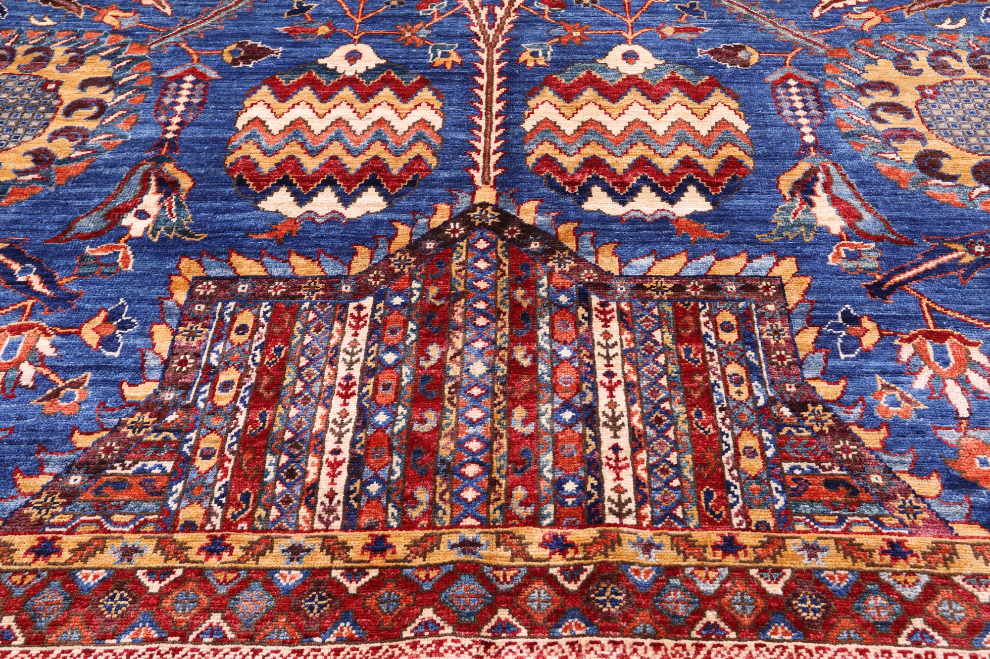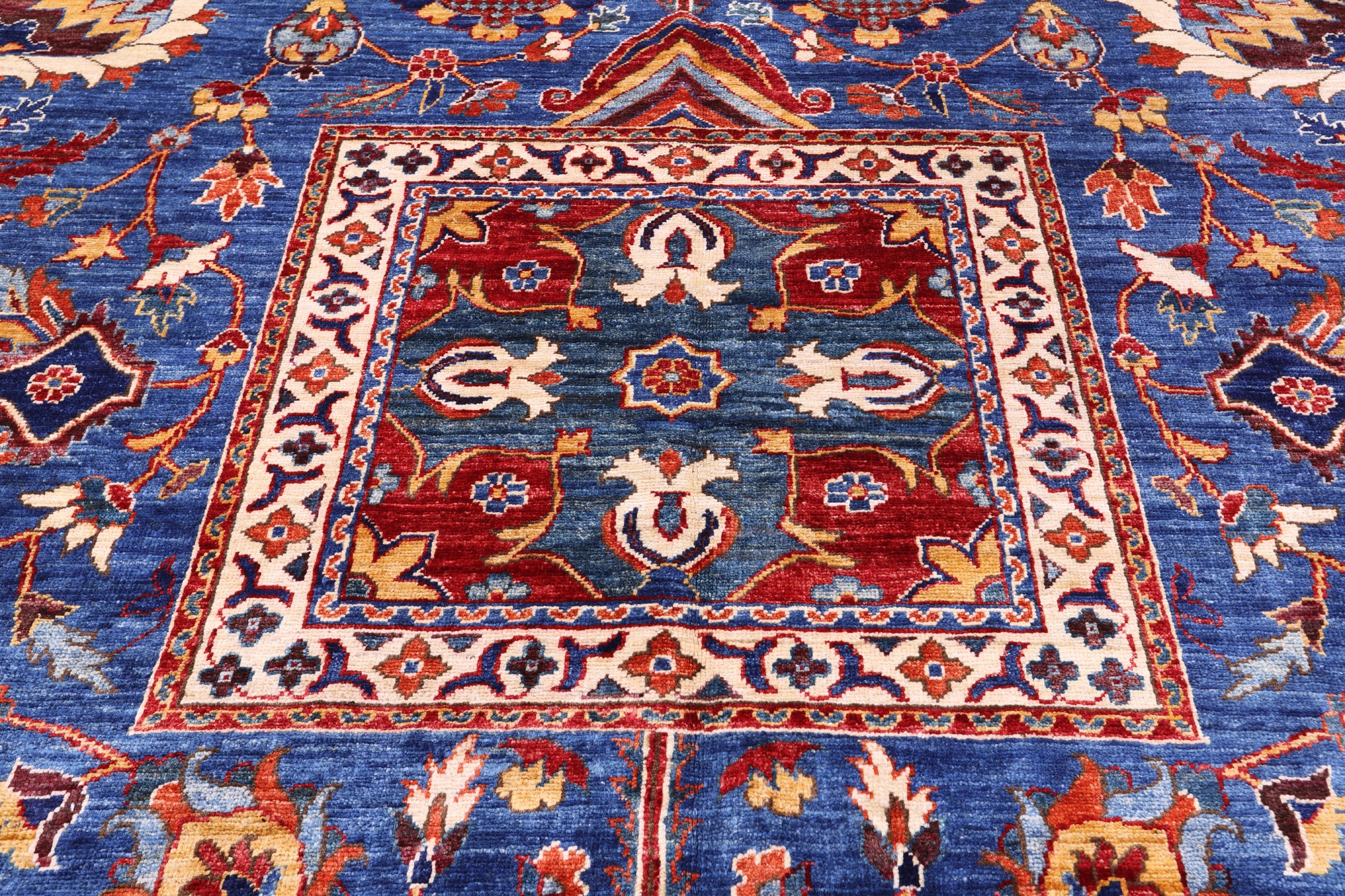 Heriz Serapi rugs are commonly known to be highly durable and are great for high traffic areas. Their medallions can be seen as large and angular, surrounded by more rigid lines and flowy floral patterns or they can also come in strictly geometric floral designs all symmetrically placed. The colors are elegant reds and indigos set against creamy ivory.