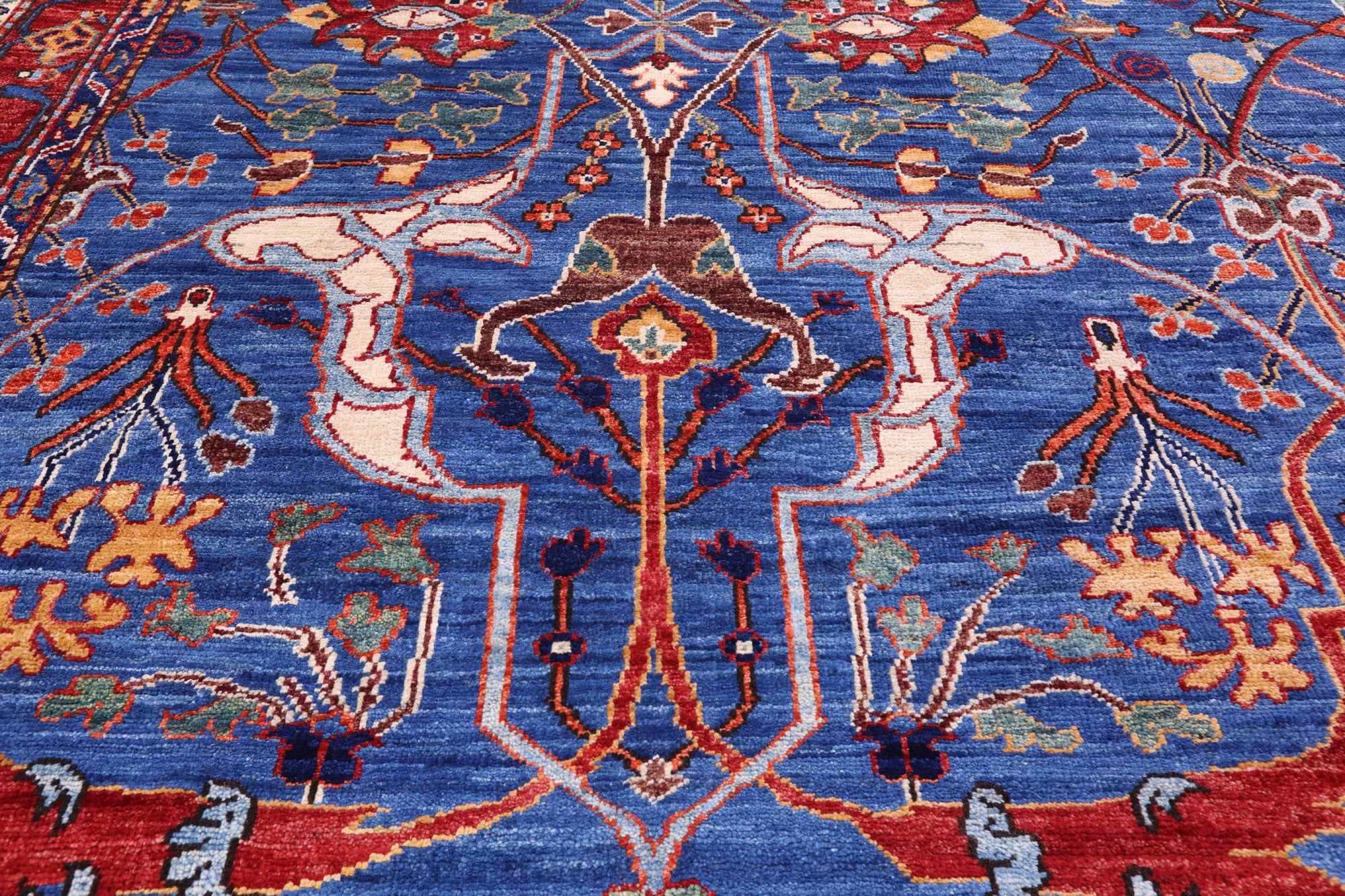 Heriz Serapi rugs are commonly known to be highly durable and are great for high traffic areas. Their medallions can be seen as large and angular, surrounded by more rigid lines and flowy floral patterns or they can also come in strictly geometric floral designs all symmetrically placed. The colors are elegant reds and indigos set against creamy ivory.