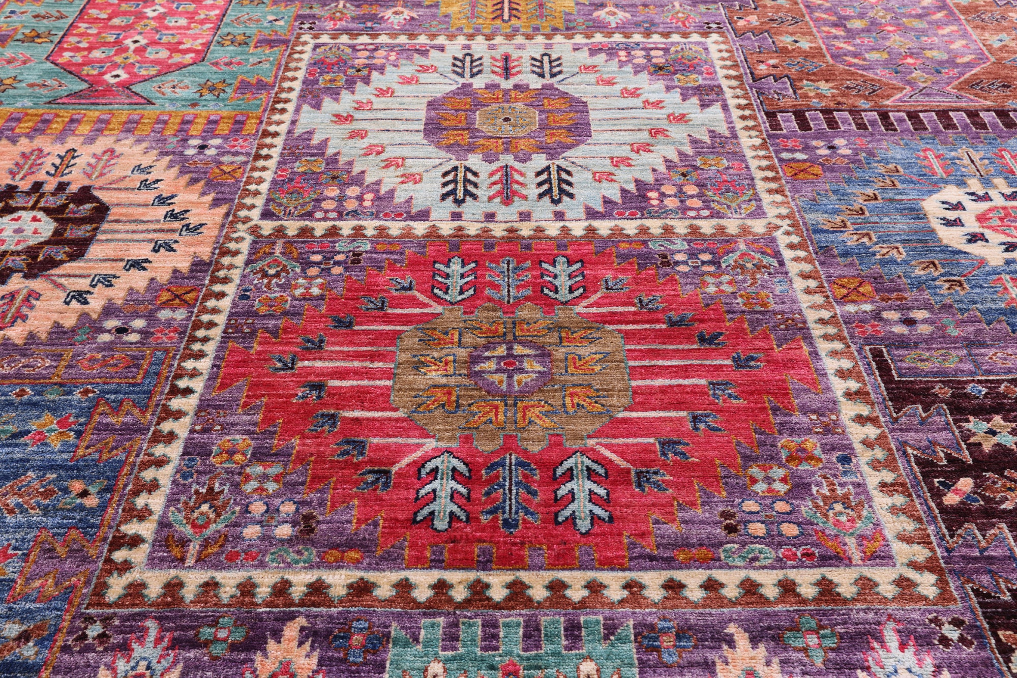 Heriz Serapi rugs are commonly known to be highly durable and are great for high traffic areas. Their medallions can be seen as large and angular, surrounded by more rigid lines and flowy floral patterns or they can also come in strictly geometric floral designs all symmetrically placed. The colors are elegant reds and indigos set against creamy ivory.