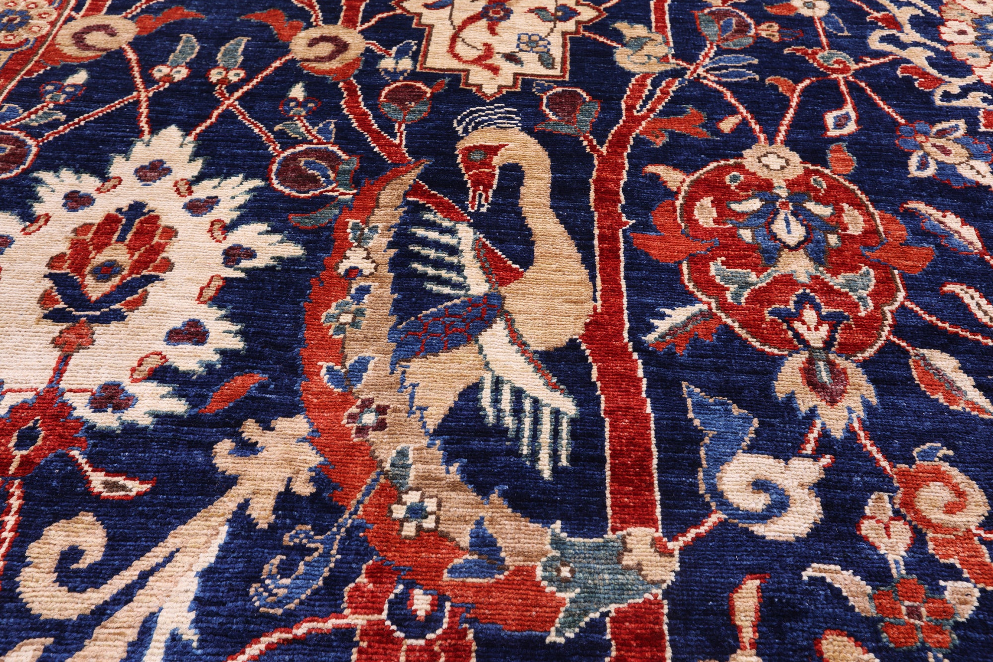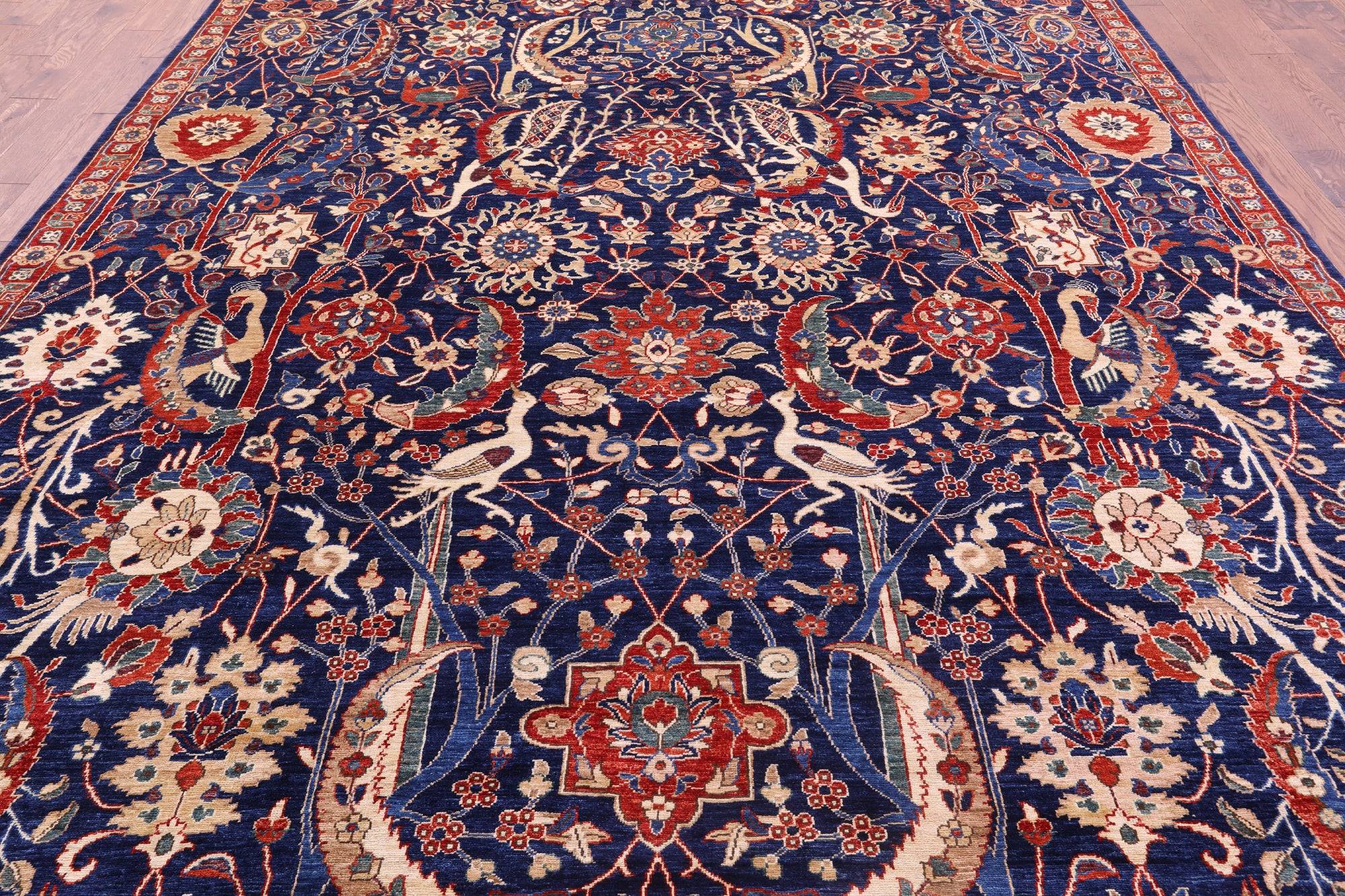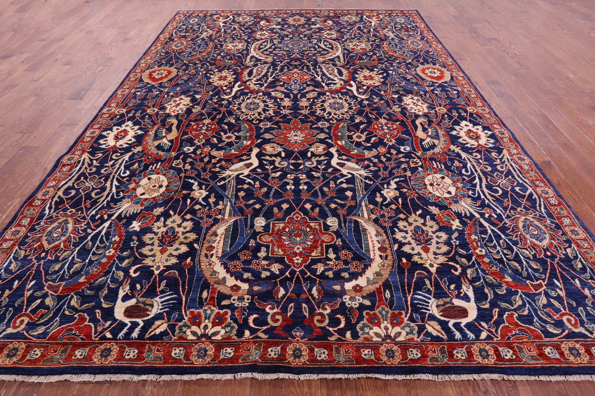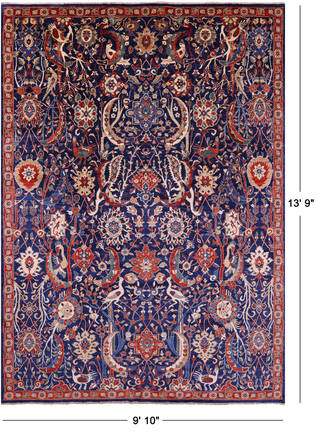 Blue Exotic Birds Persian Fine Serapi Hand Knotted Wool Rug - 9' 10" X 13' 9"