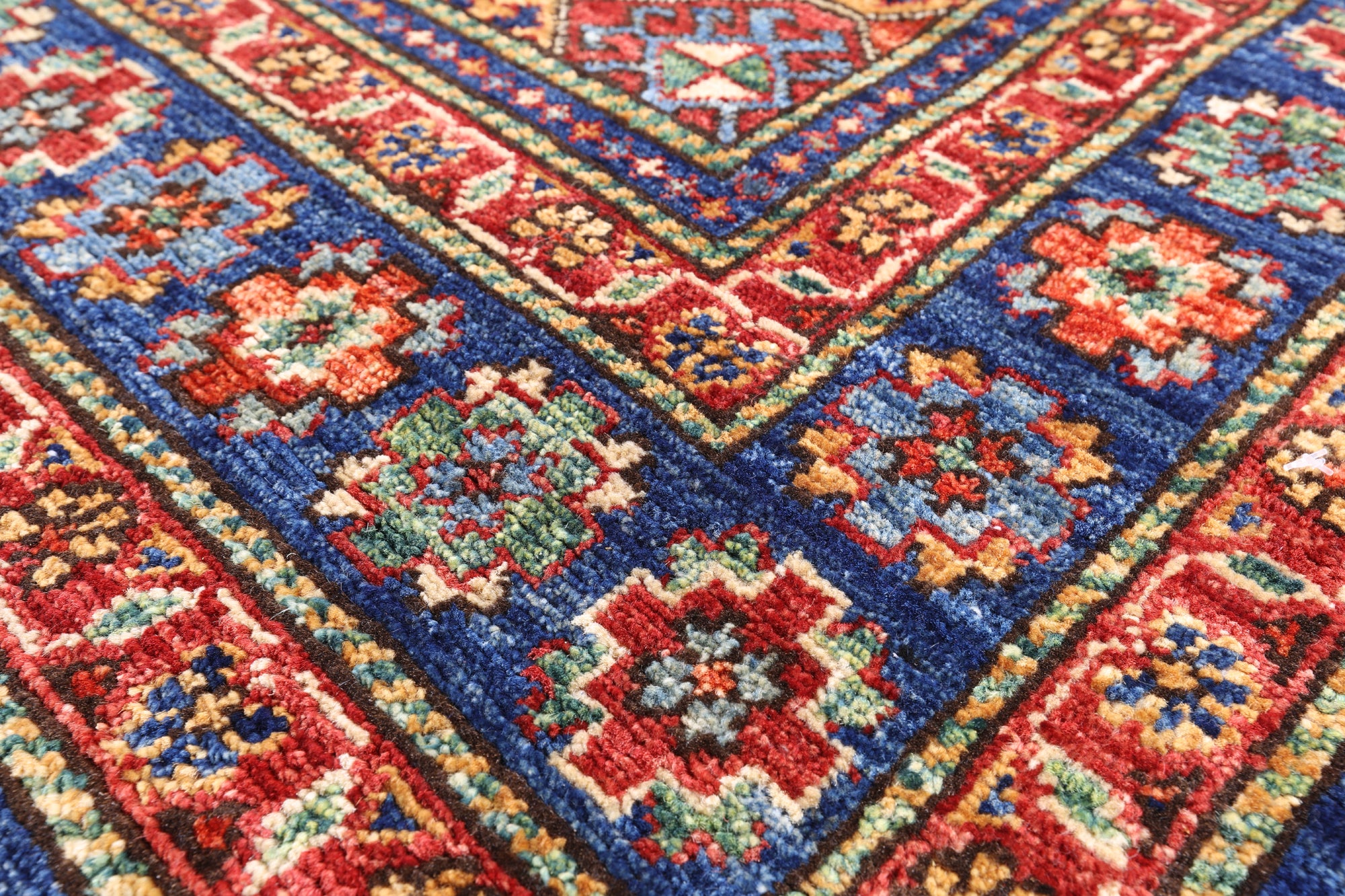 Gabbeh rugs have a simple design, mostly a geometric mix of objects resembling animals, people, trees, and are coarsely hand-knotted with handspun wool. The colors are created with all natural plant dyes, and consist of rich bright colors, such as yellow, green, blue, purple and red. Most Gabbeh designs use large fields of solid color, however when combined with another, the color is variegated throughout the rug.