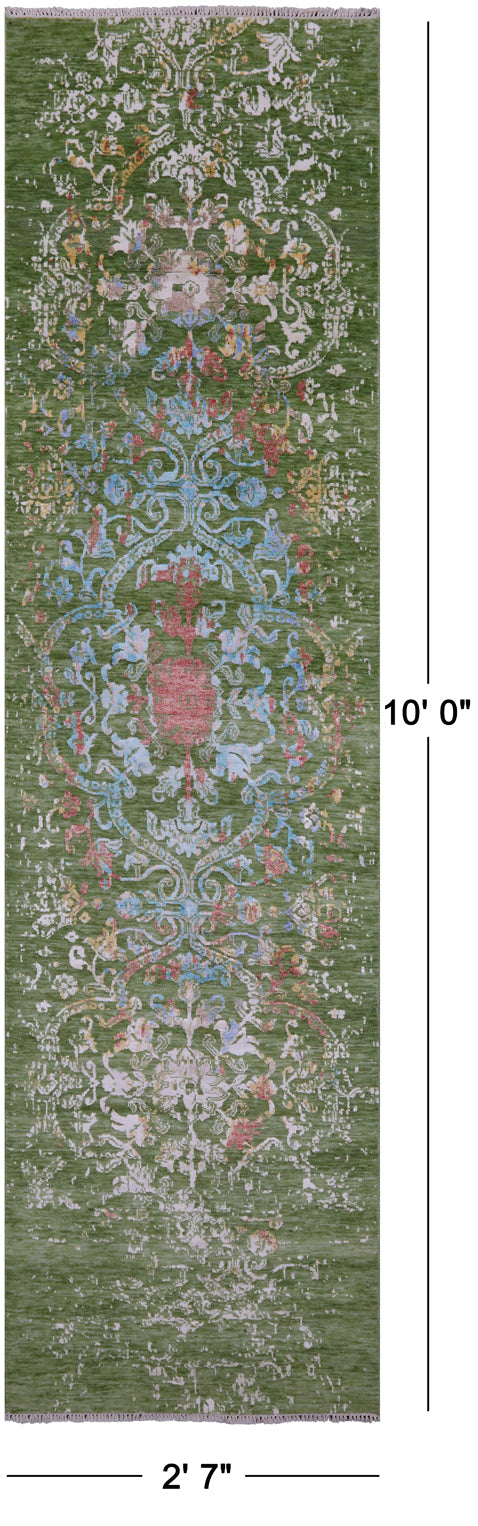 Green Persian Tabriz Hand Knotted Wool & Silk Runner Rug - 2' 7" X 10' 0"