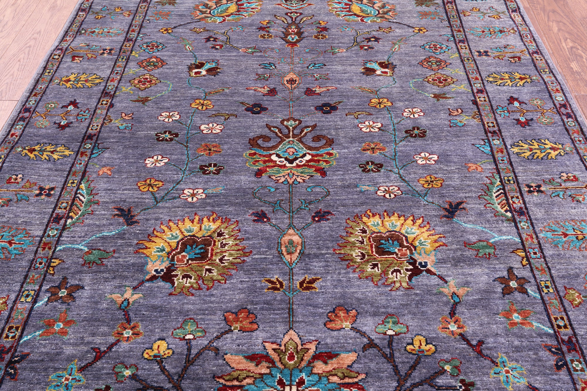 Peshawar Rugs are elegant rugs that are completely hand-spun using a wool pile and a cotton foundation. Occasionally weavers use natural silk in the pile to highlight particular features. Designs are influenced by Kazak & Caucasian styles. These rugs have an attractive natural luster as well as a durable pile and are complementary to antique or modern interiors.