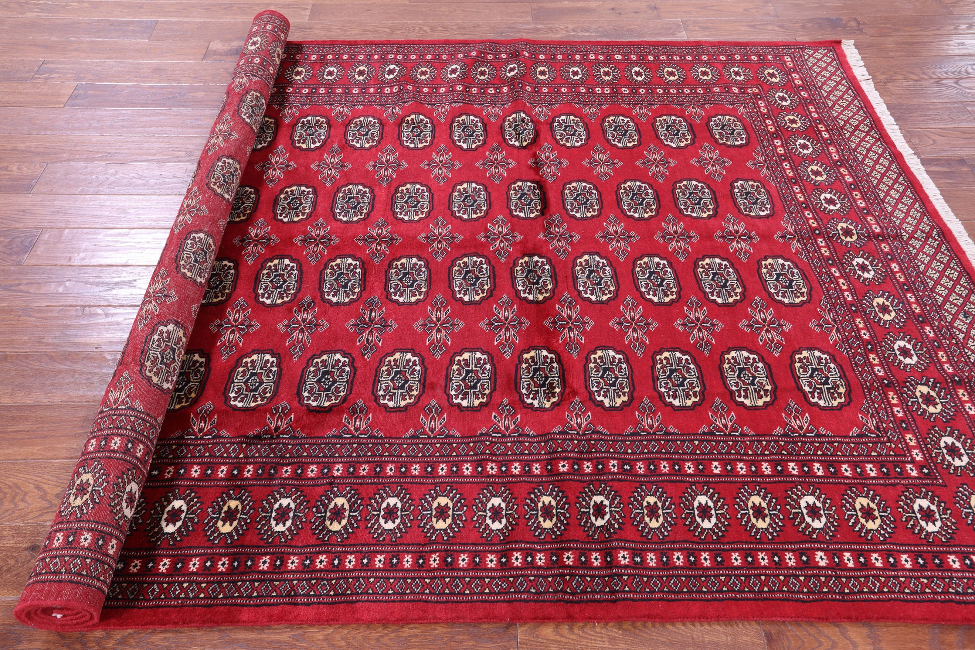 Bokhara Rugs are classic Turkoman designs originally created by nomadic tribes in India. Bokhara Rugs are among the most popular handmade rugs widely produced in Pakistan, India & Afghanistan. There foundation and heavy pile consist of wool, and have a soft luxurious feel. There unique designs consist of repeating geometric designs and vary from one tribe to another. Designs are commonly dark blue/navy, black, brown, or red with ivory accents.