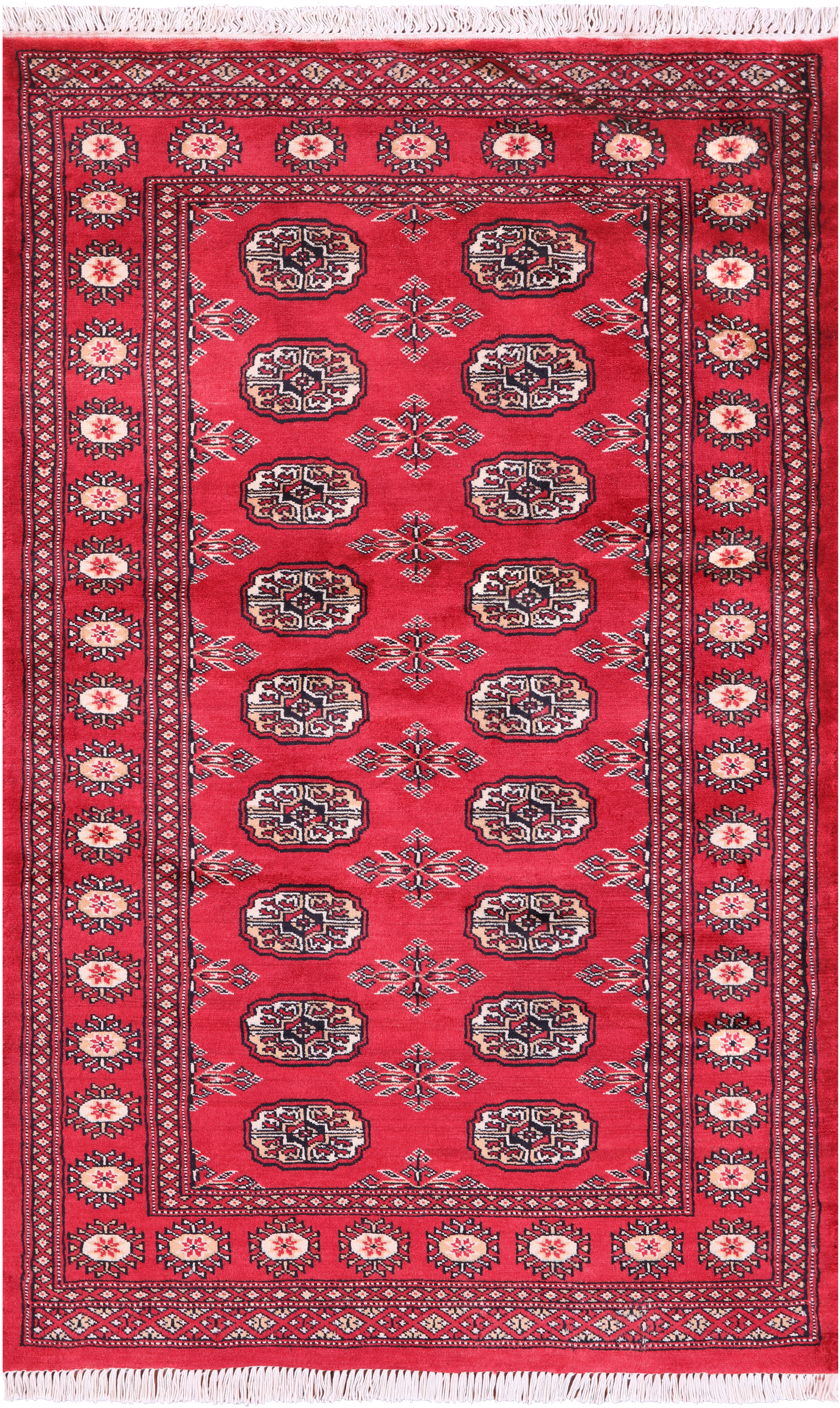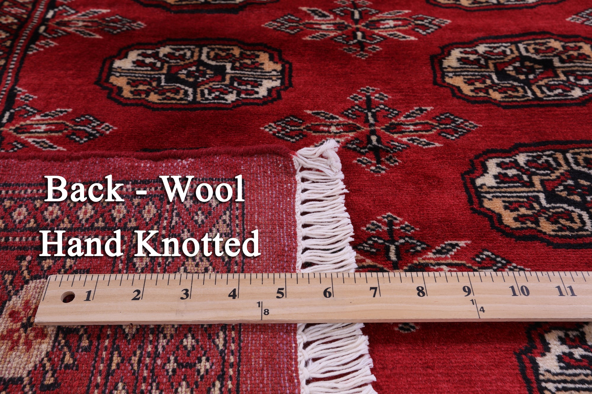 Bokhara Rugs are classic Turkoman designs originally created by nomadic tribes in India. Bokhara Rugs are among the most popular handmade rugs widely produced in Pakistan, India & Afghanistan. There foundation and heavy pile consist of wool, and have a soft luxurious feel. There unique designs consist of repeating geometric designs and vary from one tribe to another. Designs are commonly dark blue/navy, black, brown, or red with ivory accents.