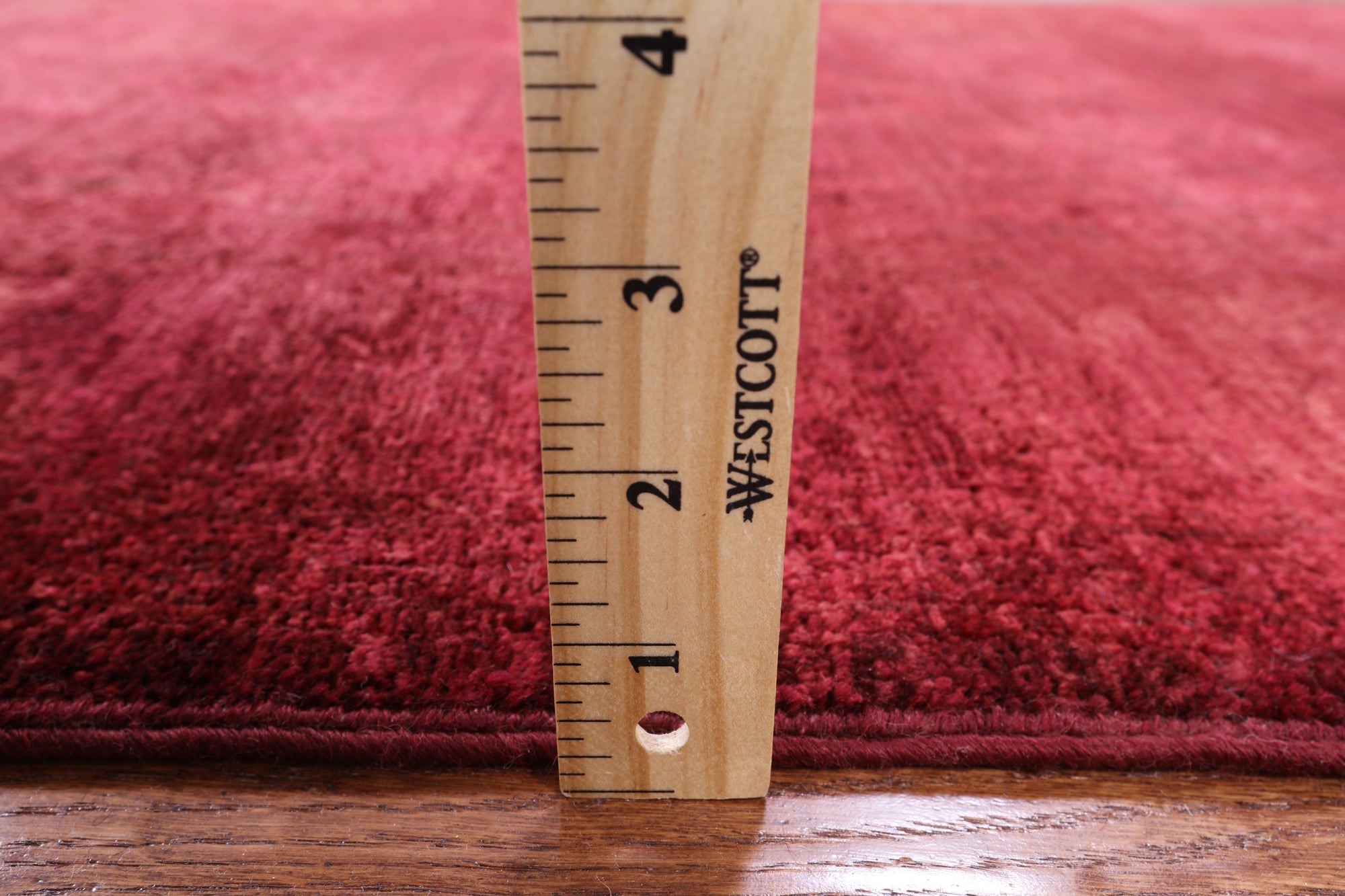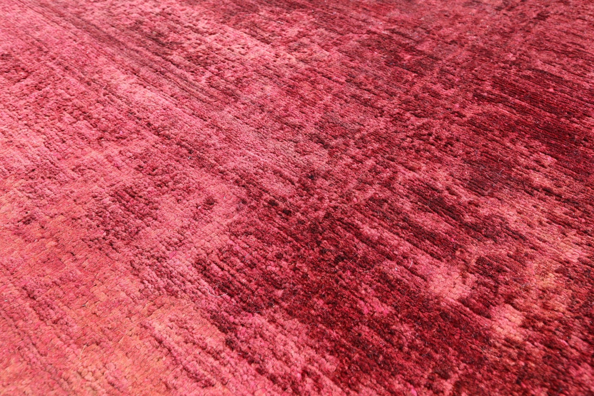 Over-dyed rugs undergo a series of processes to neutralize & lift the original color of the rug. This includes a mixture of chemical washes & natural sun bleaching. During this process, the pattern is not removed, but instead the outline of the design is left, creating a foundation ready to be re-imagined. The carpets are then dyed in one color, sometimes repeatedly in order to reach the desired saturation level.