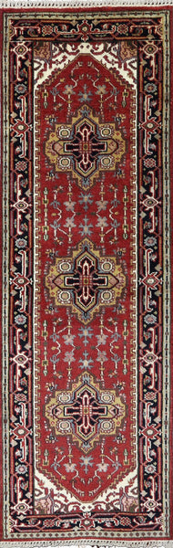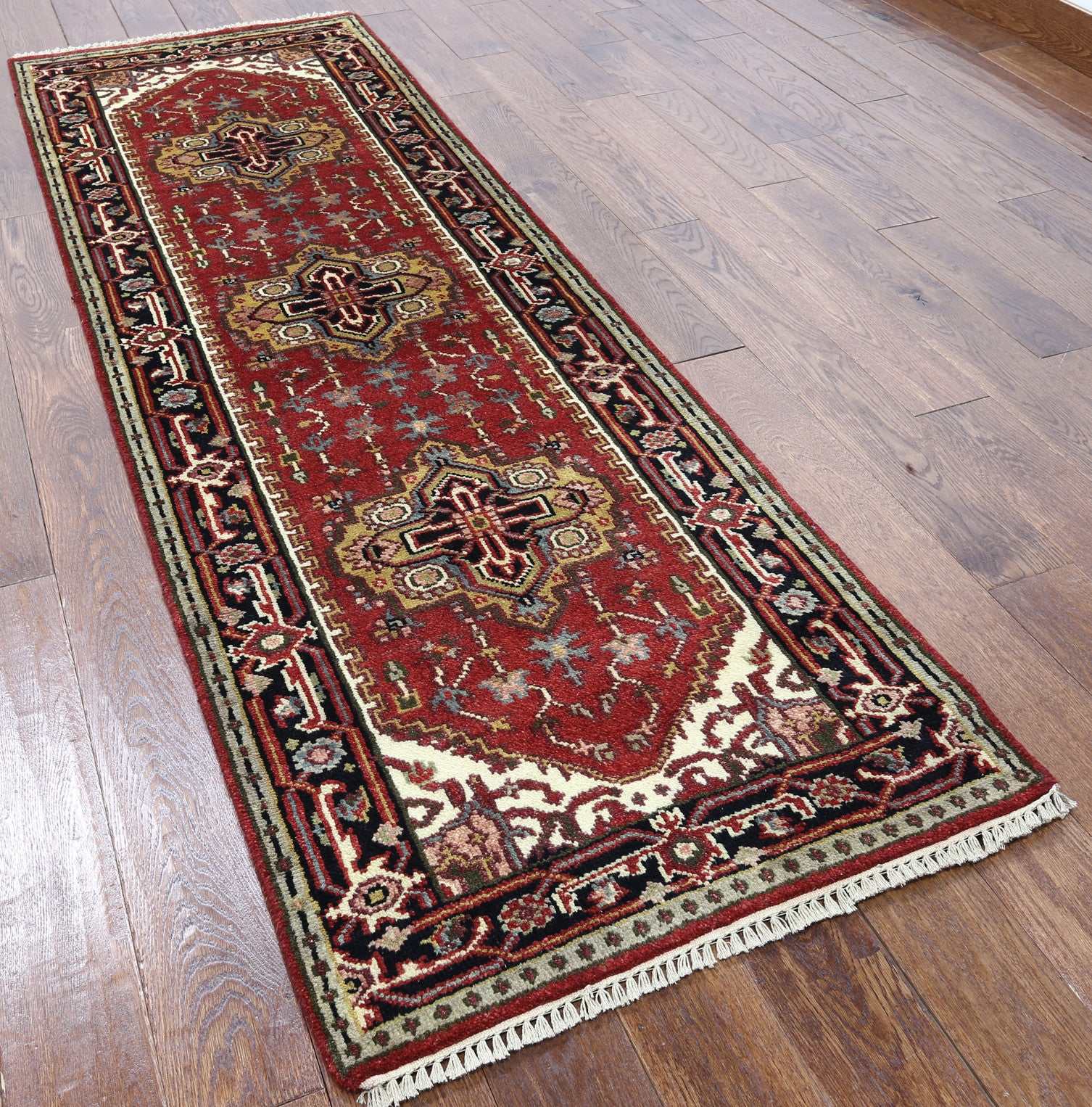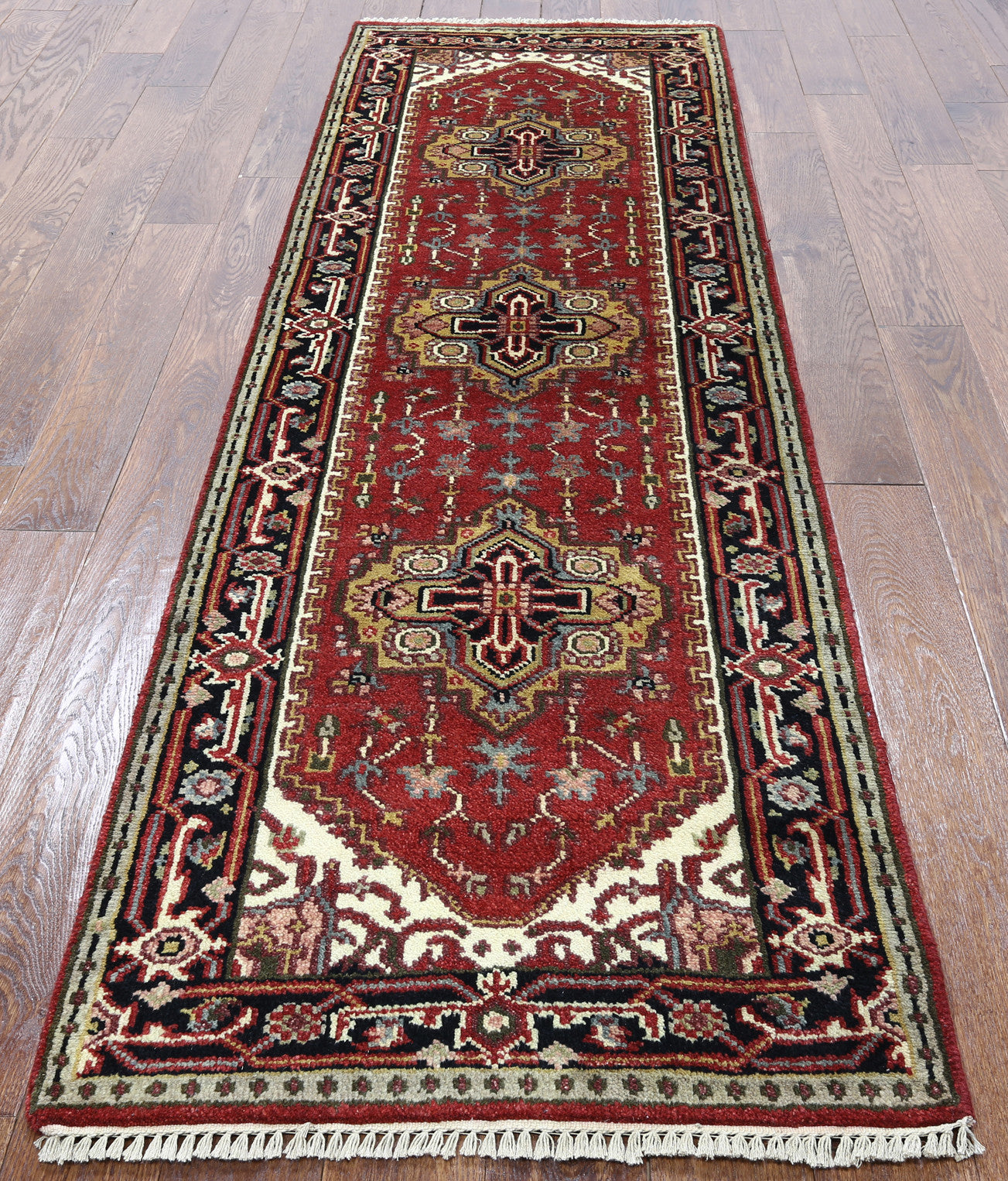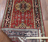 Heriz/Serapi Rugs are hand-knotted with a thick, heavy pile and a rich color palette. Most designs are large geometric medallions or an all over highly stylized floral motif design. Serapi’s are made with pure natural vegetable dyes, hand-spun wool, graphic designs and inspired artistry. Traditional Heriz colors are red, black, blues, & ivory.