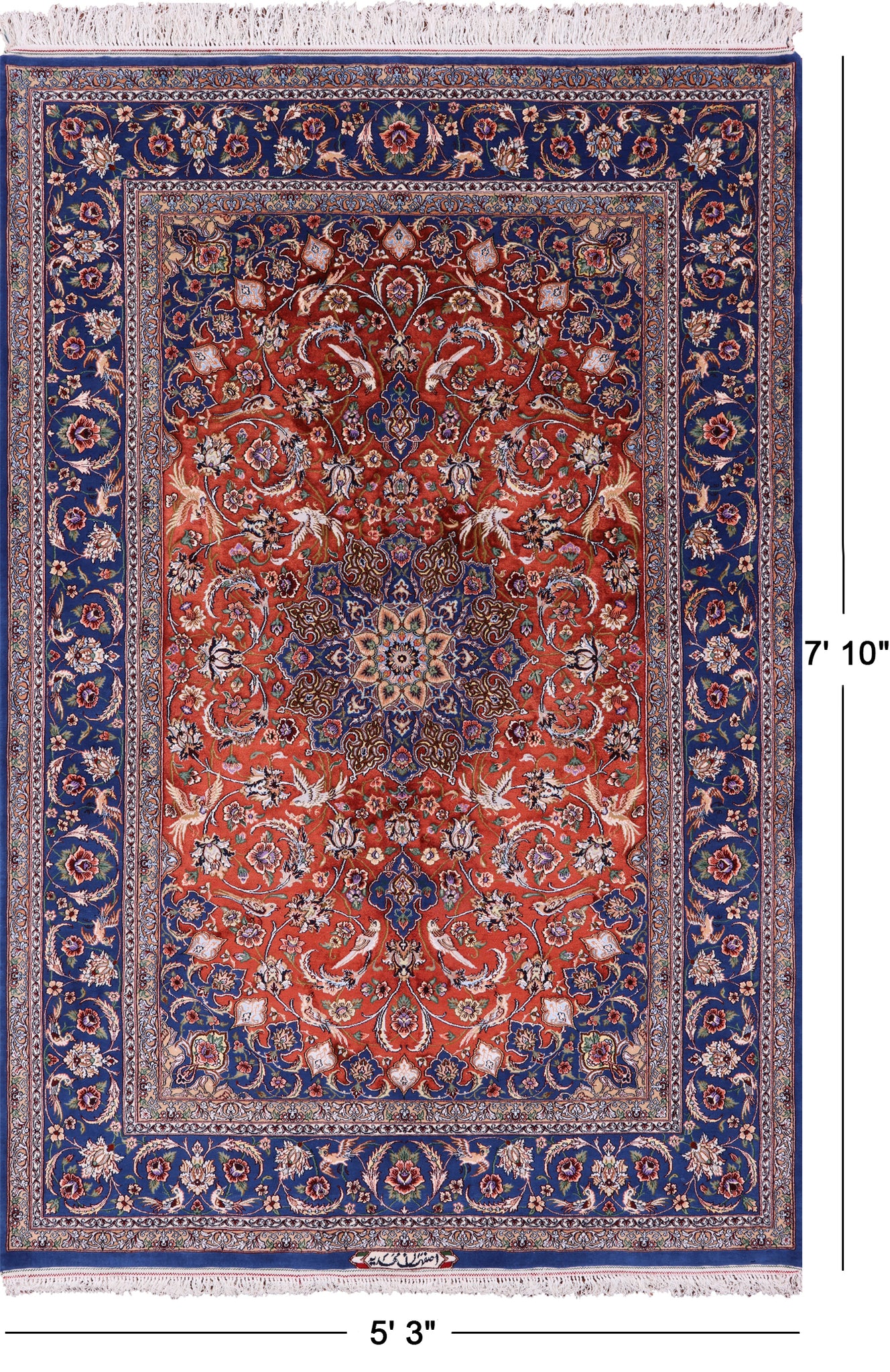 Red Signed Isfahan Authentic Persian Hand Knotted Wool & Silk Area Rug - 5' 3" X 7' 10"