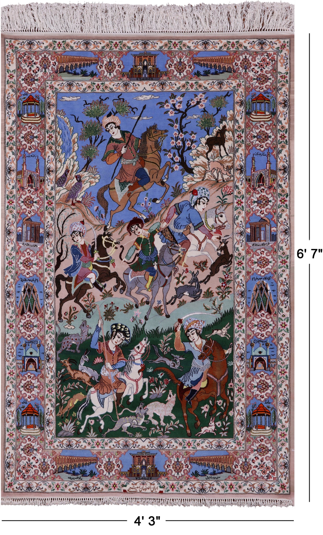 Signed Isfahan Authentic Persian Hunting Scene Hand Knotted Wool & Silk Area Rug - 4' 3" X 6' 7"