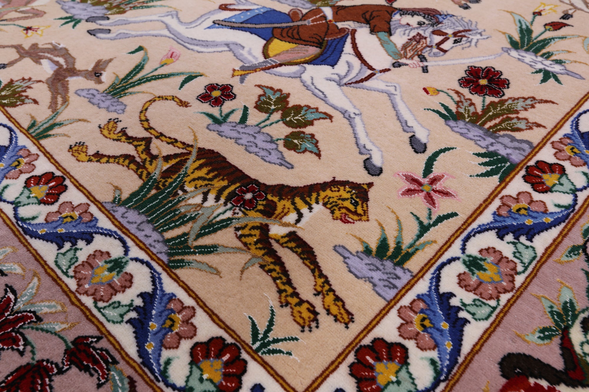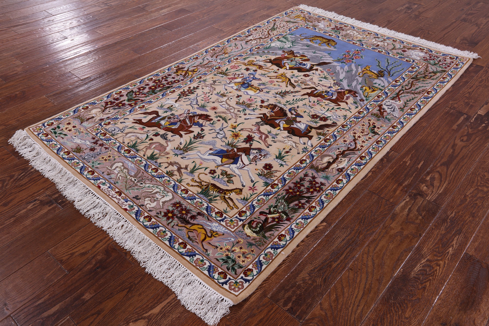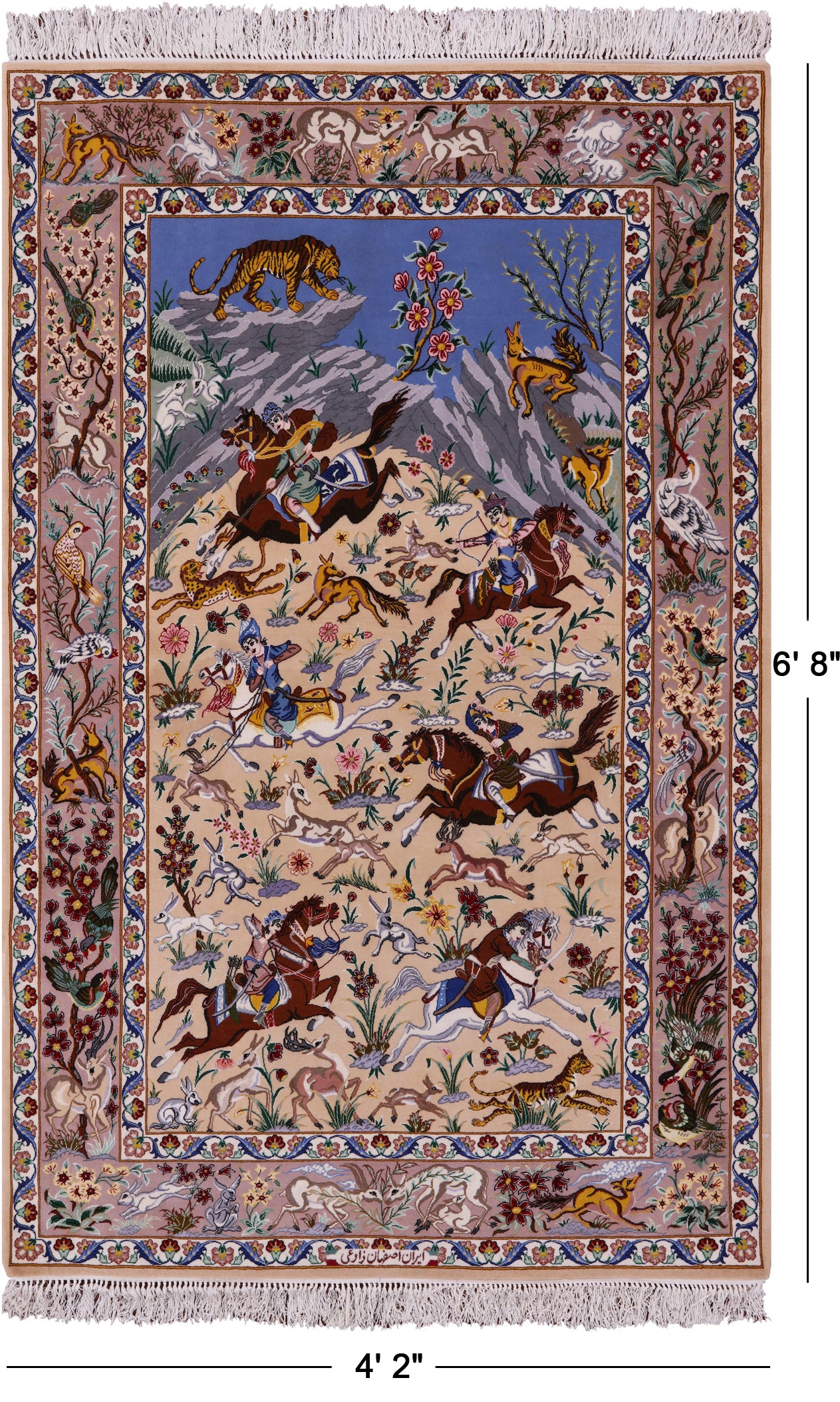 Signed Isfahan Authentic Persian Hunting Scene Hand Knotted Wool & Silk Area Rug - 4' 2" X 6' 8"