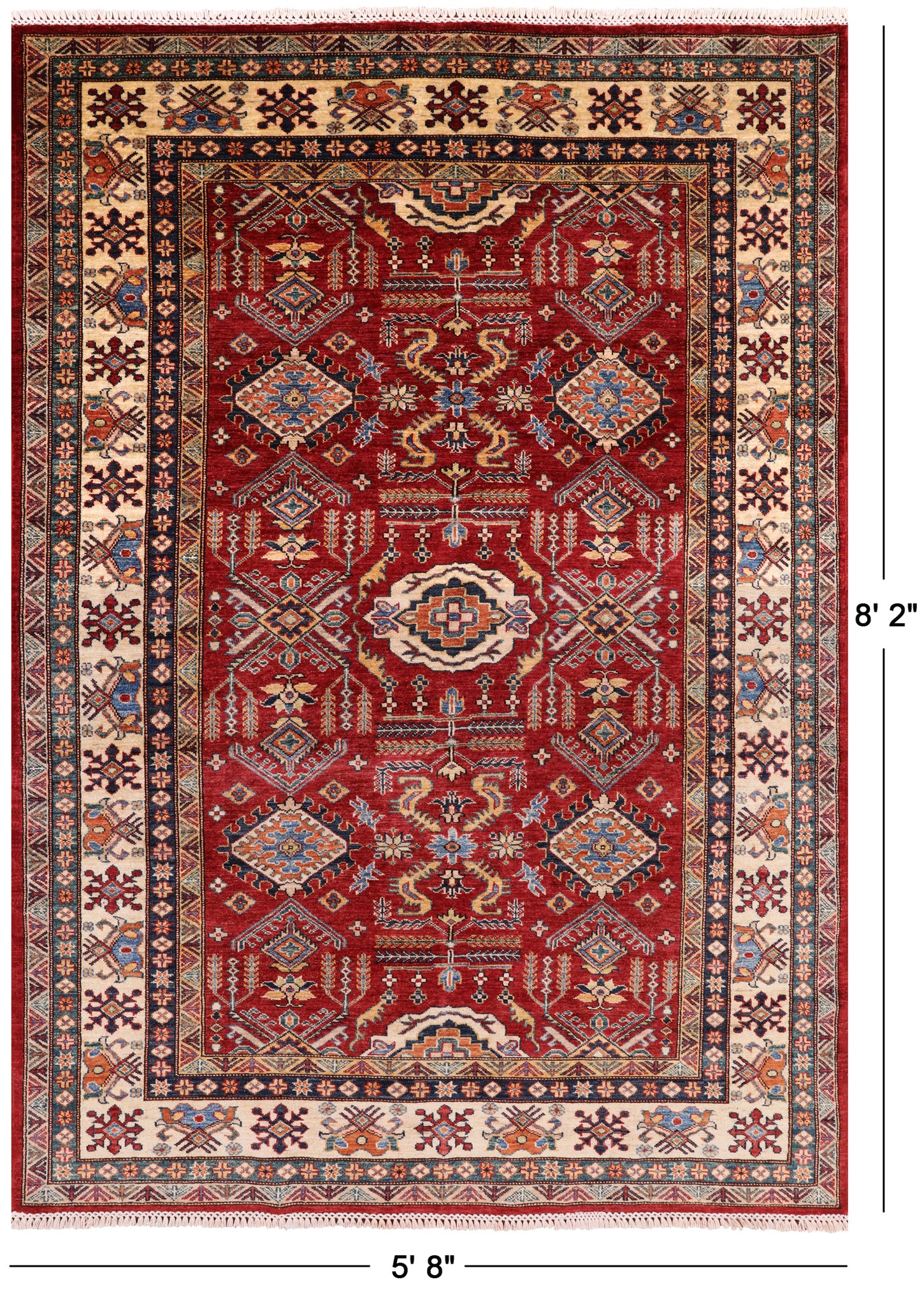 Kazak Rugs are popular for their stunning geometric designs & high quality dyes. Kazak patterns tend to be red, yellow/gold and blue. Designs include, but are not limited to animals, flowers, medallions, & iconic figures such as geometric people/ and animals & symbolic motifs.