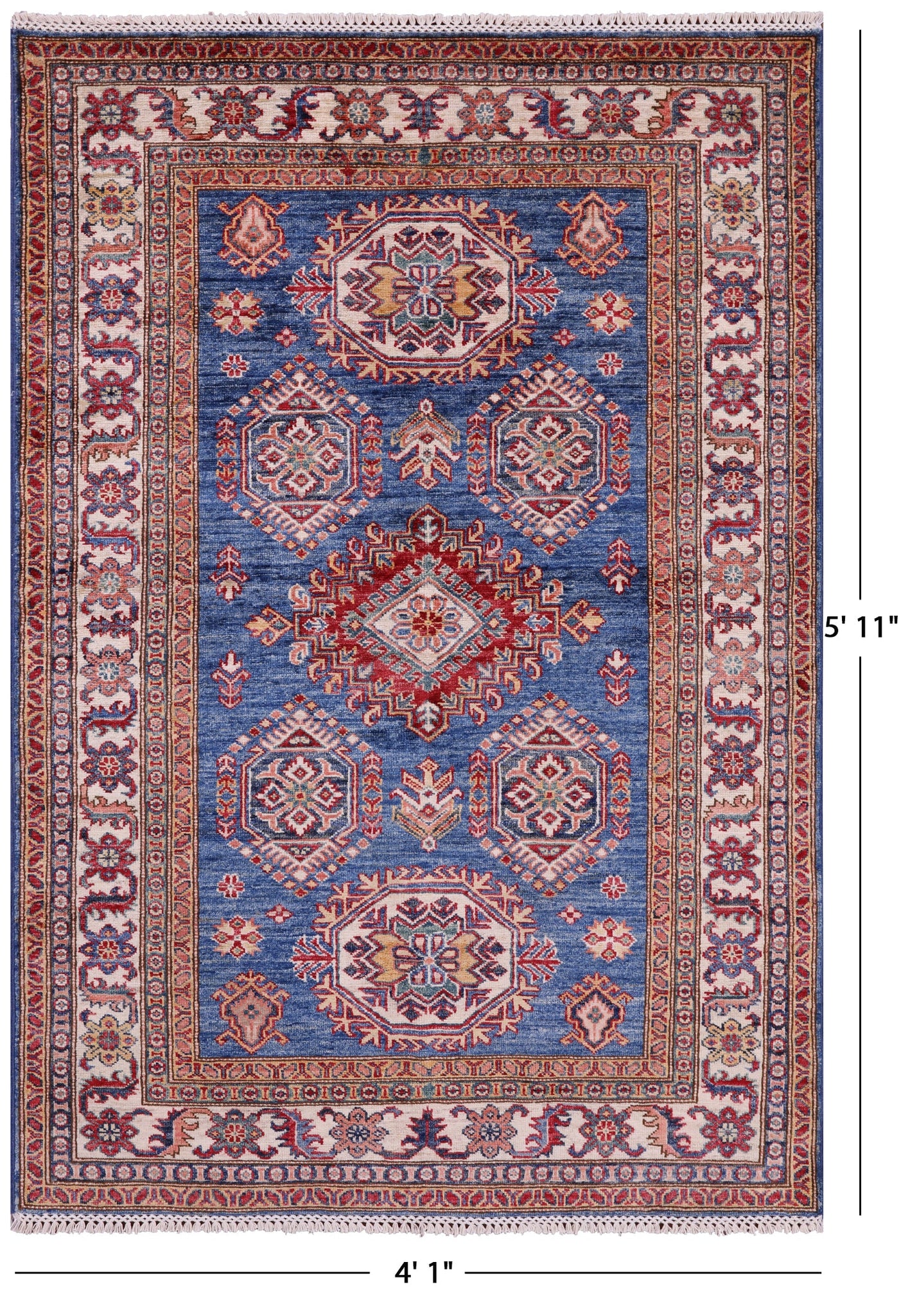 Blue Super Kazak Handmade Wool Rug - 4' 1" X 5' 11"