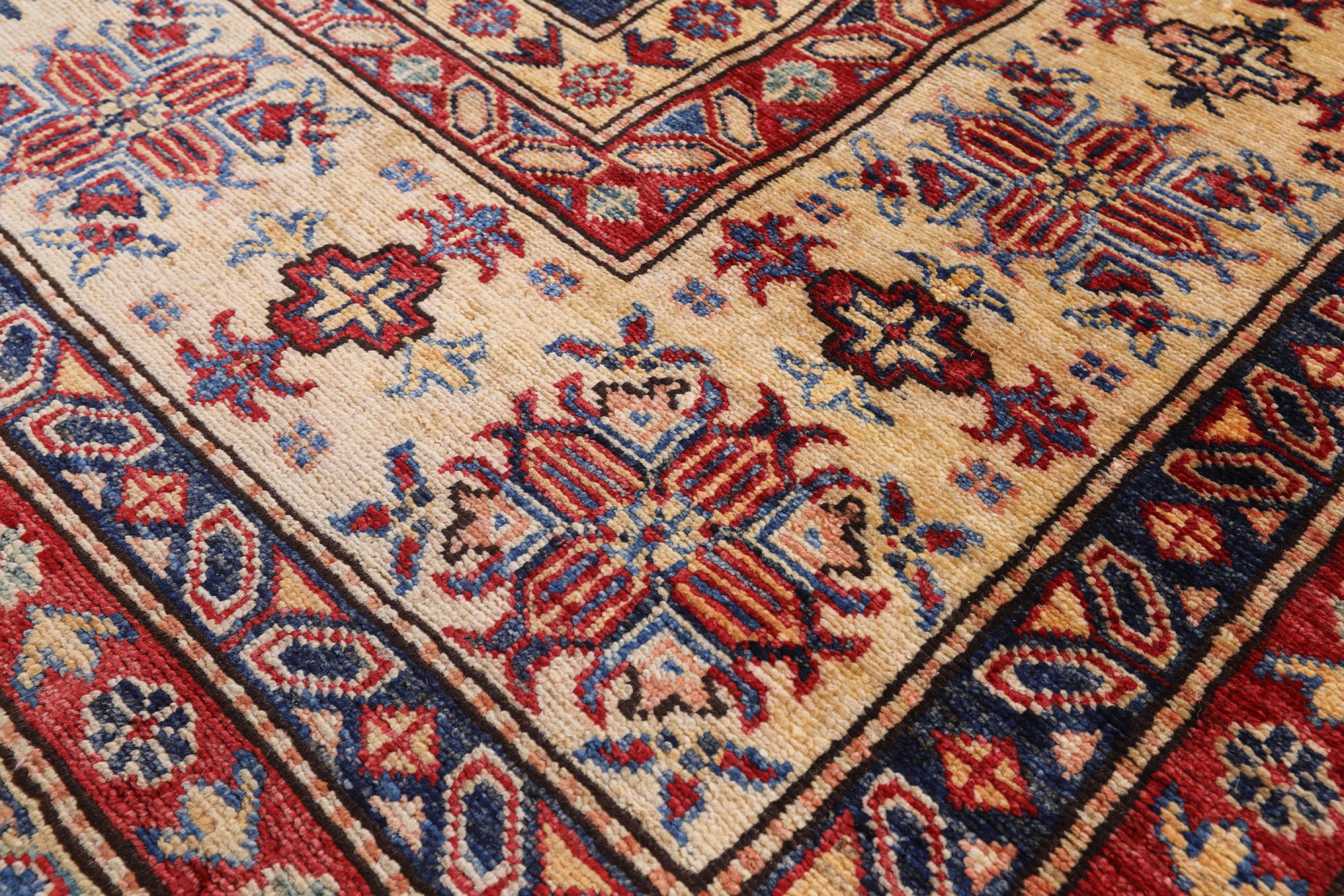 Kazak Rugs are popular for their stunning geometric designs & high quality dyes. Kazak patterns tend to be red, yellow/gold and blue. Designs include, but are not limited to animals, flowers, medallions, & iconic figures such as geometric people/ and animals & symbolic motifs.