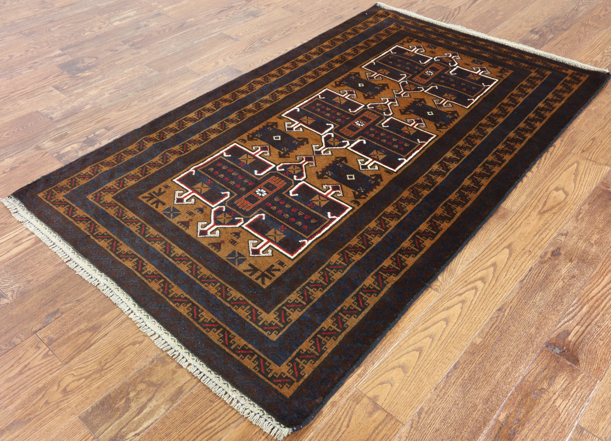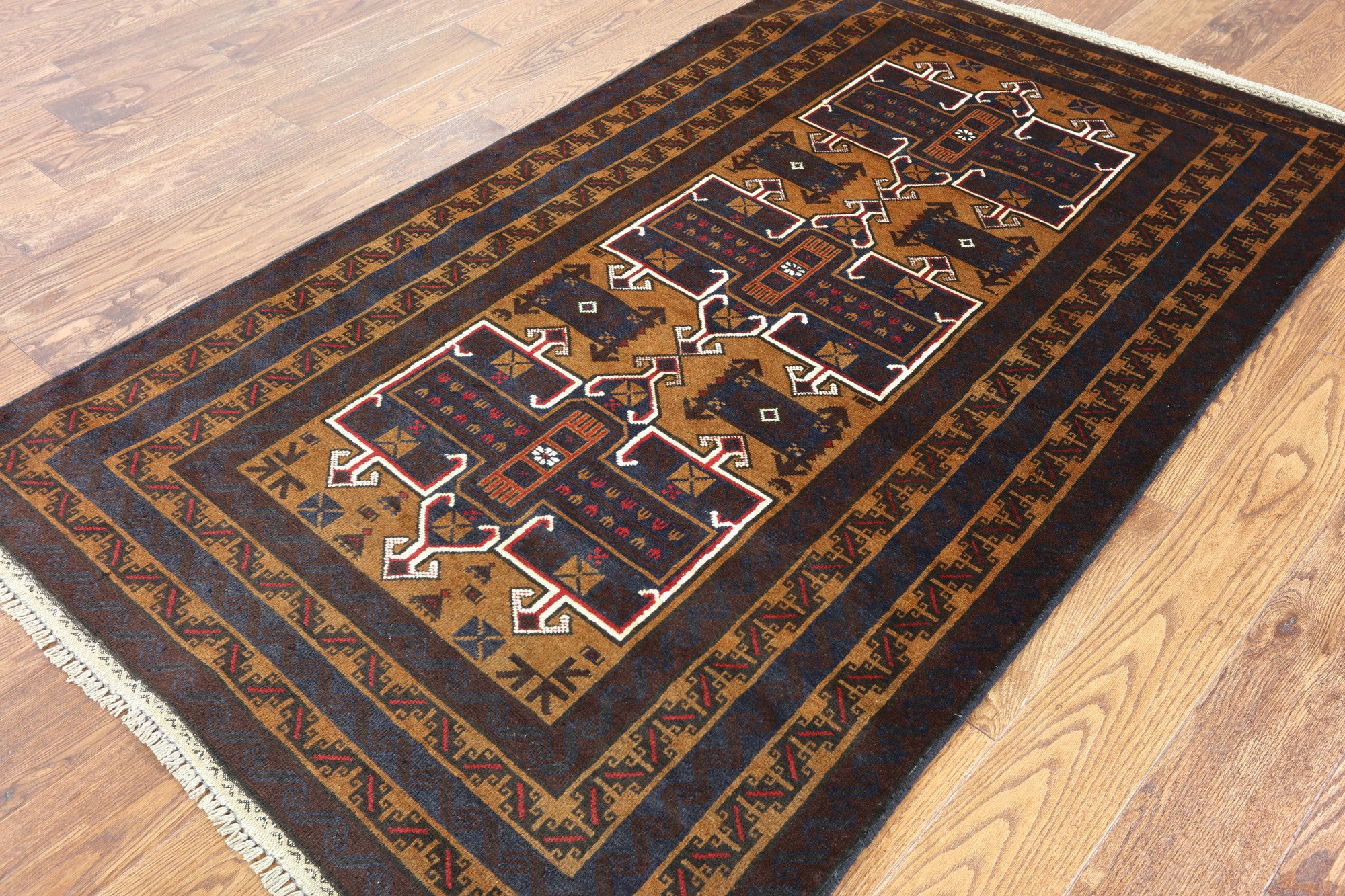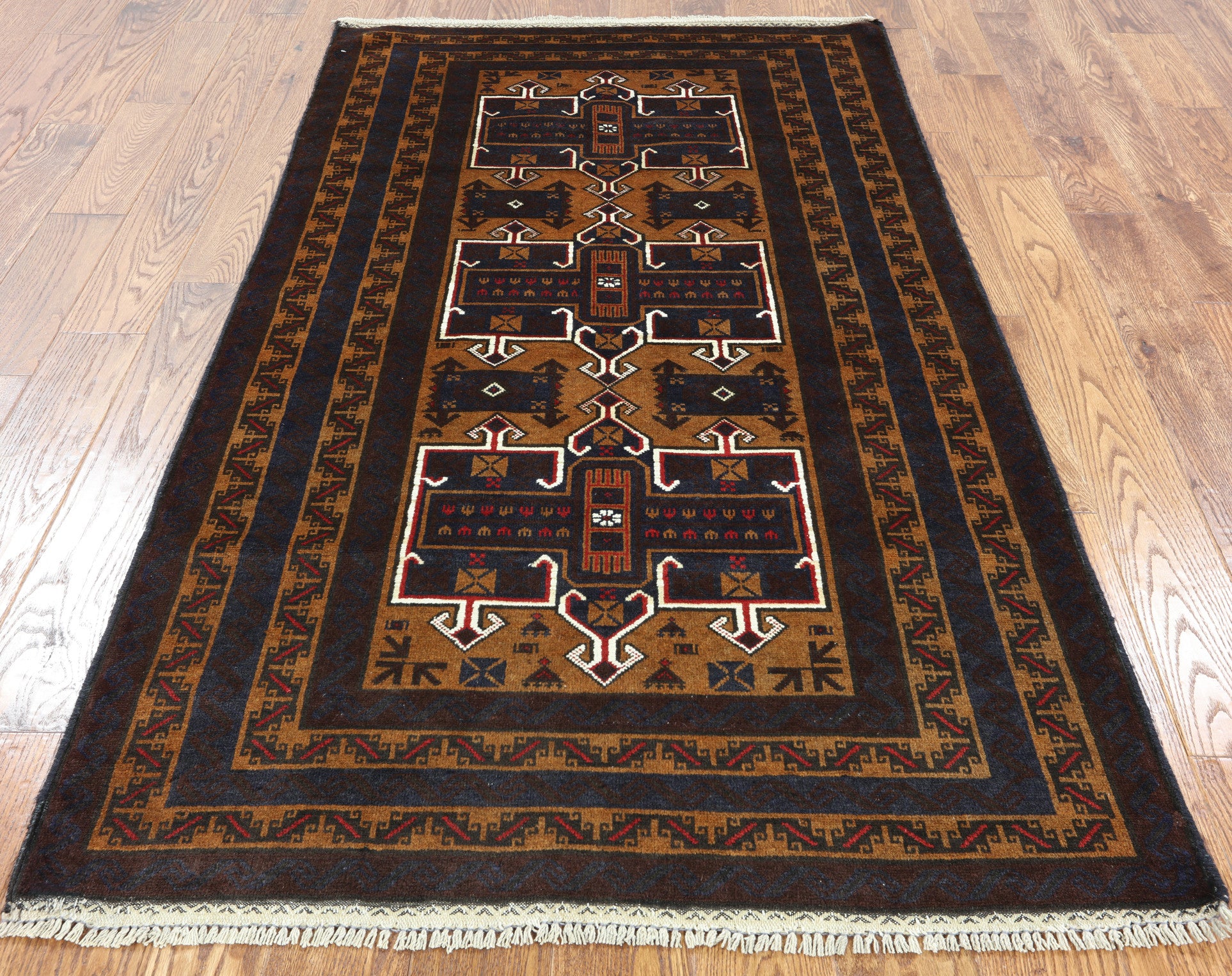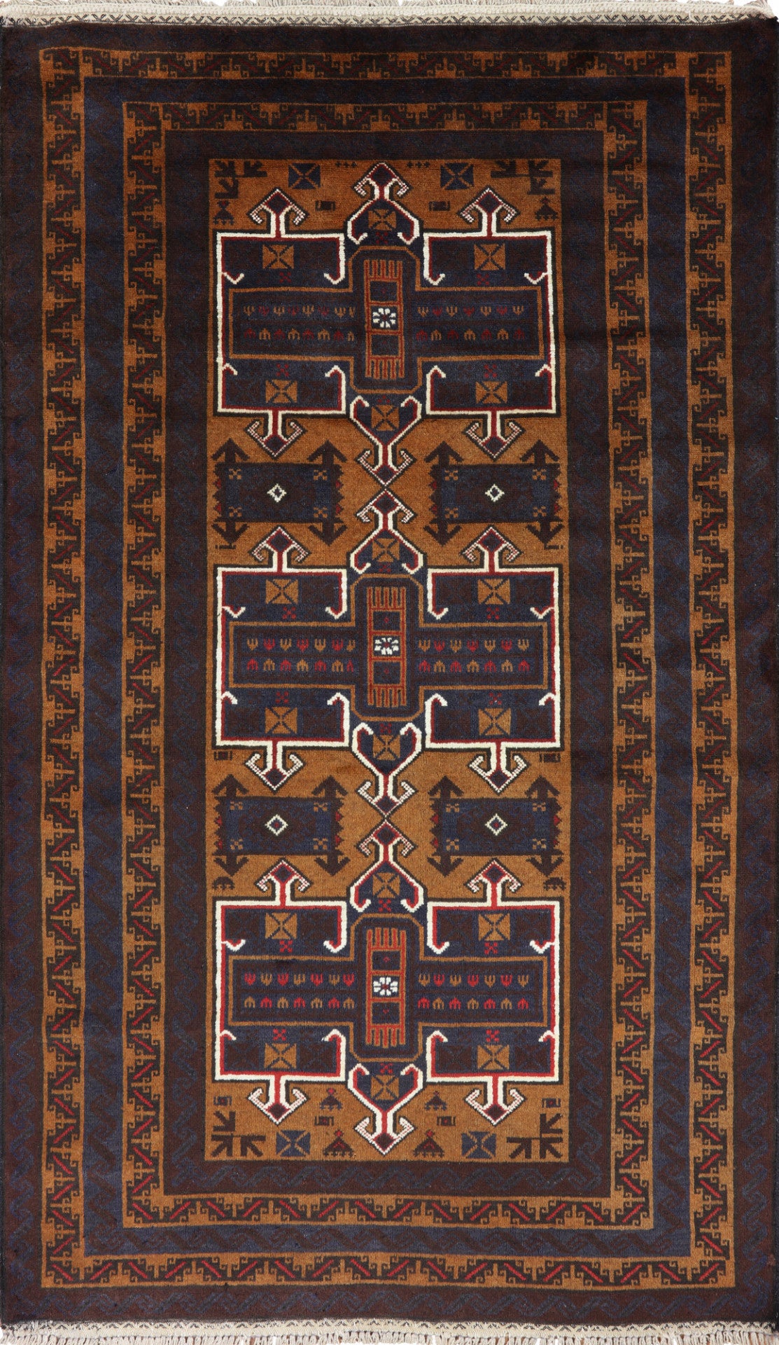 Baluch (Balouch) rugs are unique because there are no duplicates. Each rug differs in design, either Tribal, repeated Camel print or Gul medallions. Baluch rugs are soft & flexible and each contains a form of history that is used to express and follow ancient Persian tradition. Baluch colors are predominately burgundy with a navy blue, black, brown, rust, and red, with occasional sites of yellow, orange, green & white for outlining.