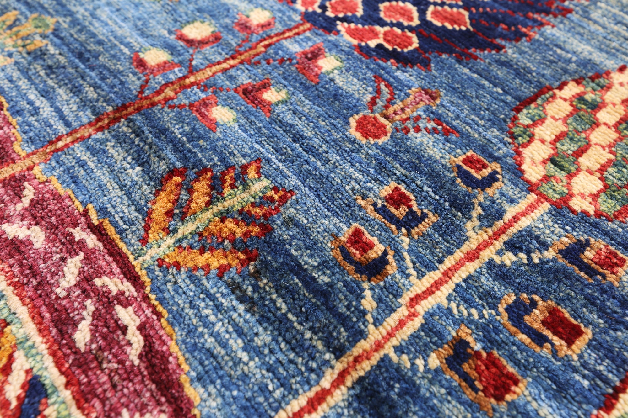 Gabbeh Rugs feature hand-spun wool in both the pile and foundation. These rugs are characterized by their abstract designs that relies upon open fields of color and a playfulness with geometric figures used to depict a story, person, or event. Gabbeh Rugs are popular in a contemporary or modern setting and are extremely durable, usually small to medium size.