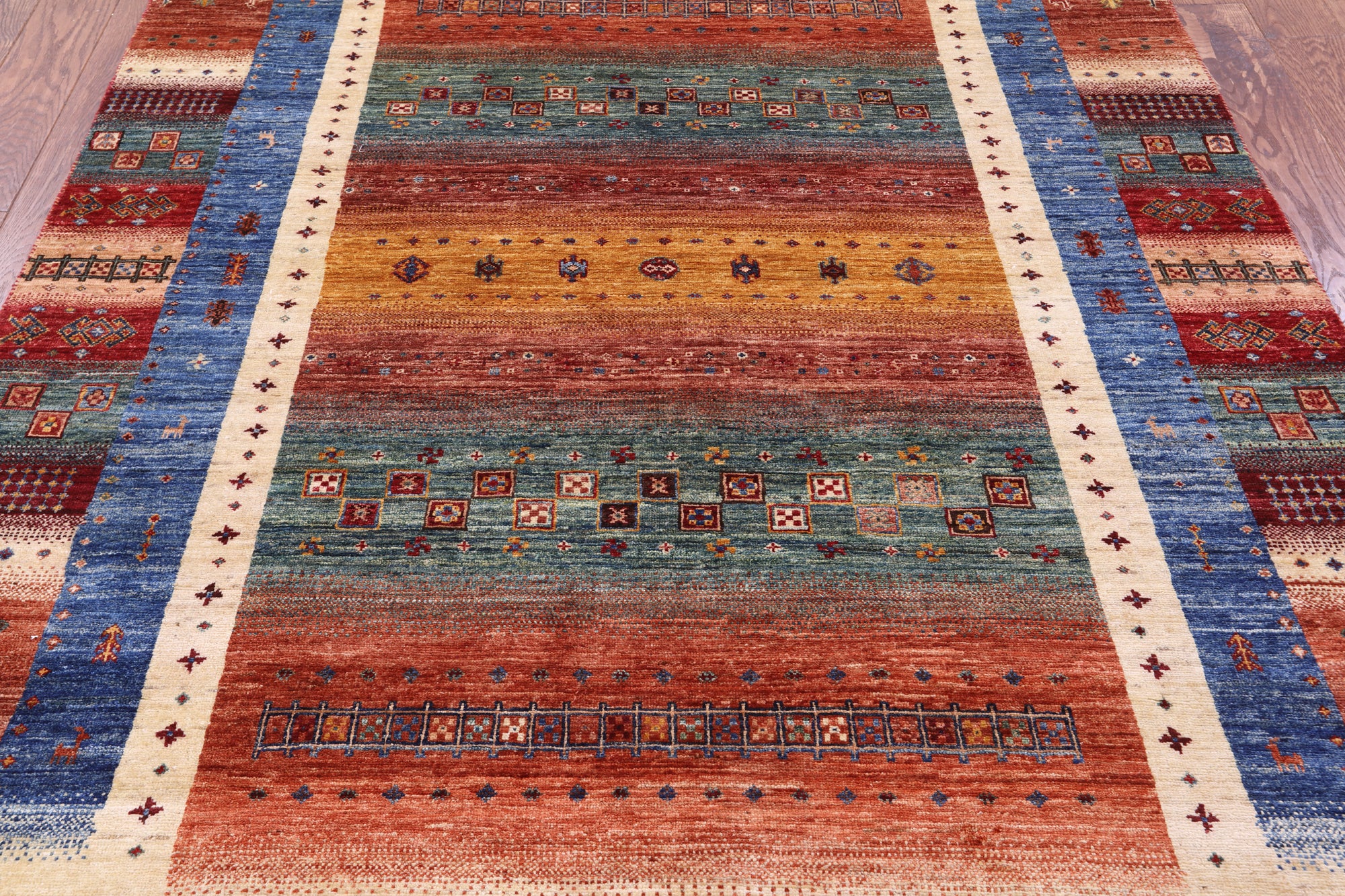 Gabbeh Rugs feature hand-spun wool in both the pile and foundation. These rugs are characterized by their abstract designs that relies upon open fields of color and a playfulness with geometric figures used to depict a story, person, or event. Gabbeh Rugs are popular in a contemporary or modern setting and are extremely durable, usually small to medium size.