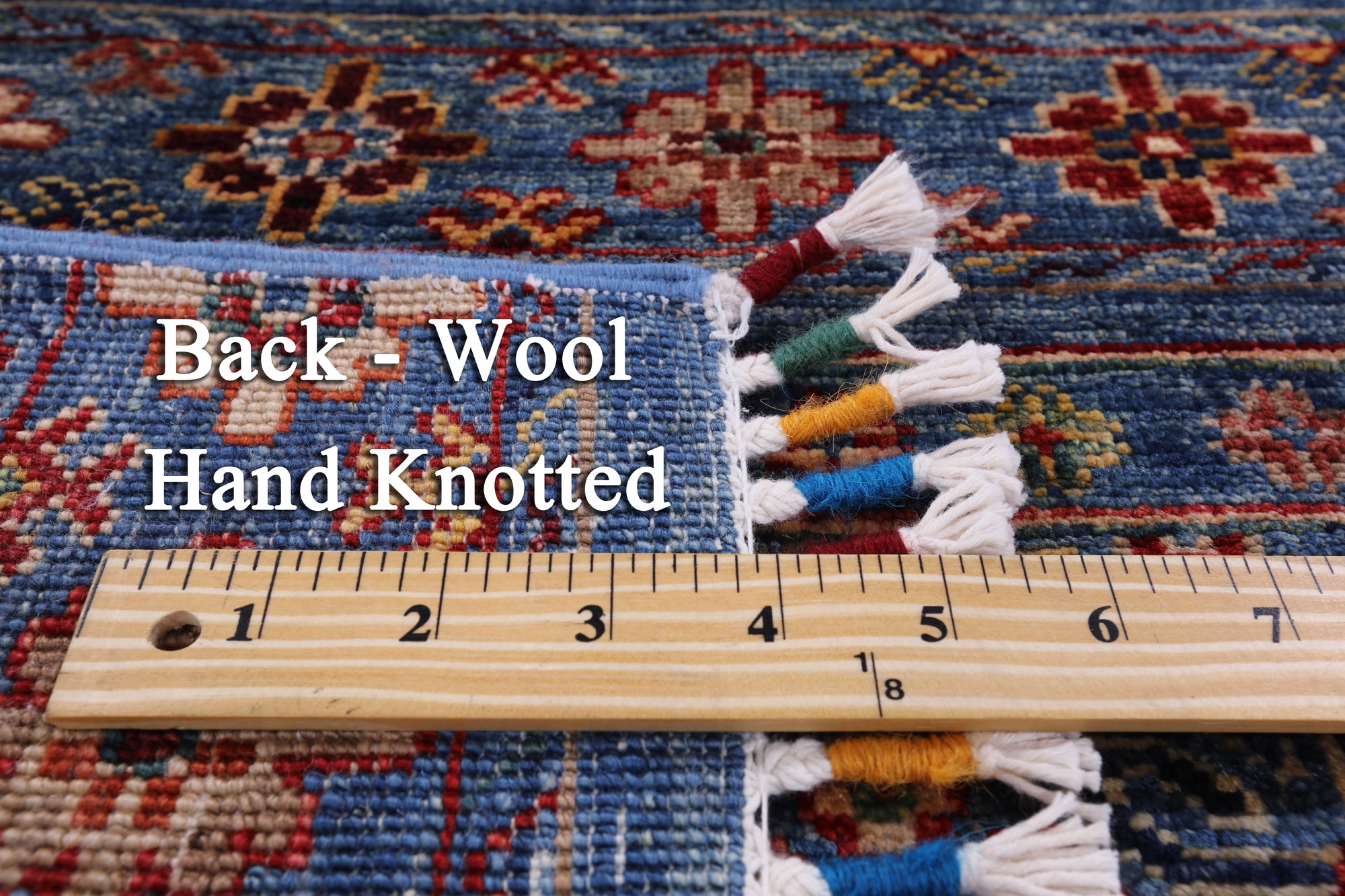 Gabbeh rugs have a simple design, mostly a geometric mix of objects resembling animals, people, trees, and are coarsely hand-knotted with handspun wool. The colors are created with all natural plant dyes, and consist of rich bright colors, such as yellow, green, blue, purple and red. Most Gabbeh designs use large fields of solid color, however when combined with another, the color is variegated throughout the rug.