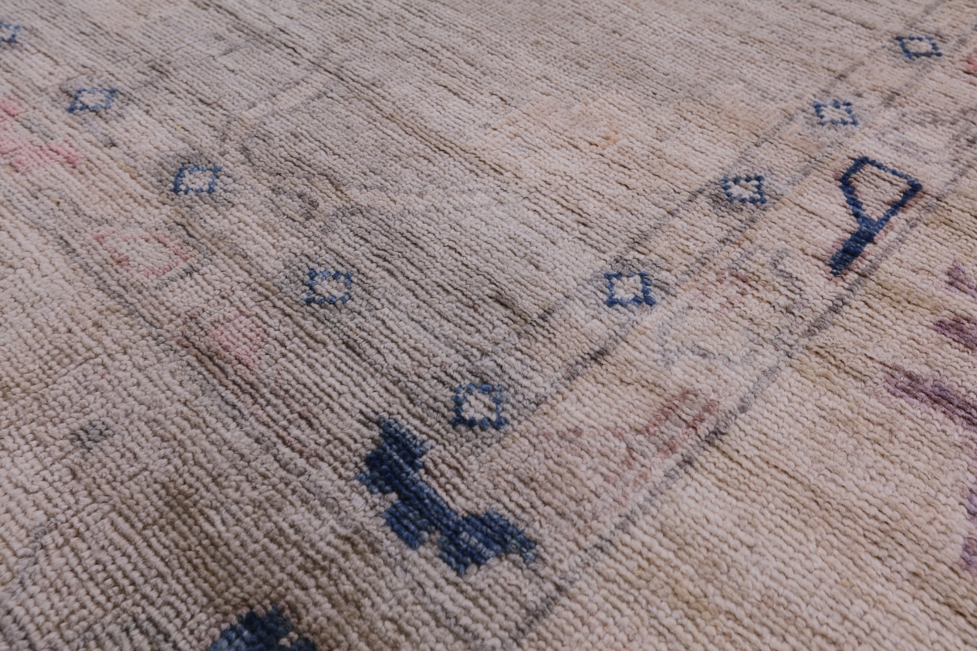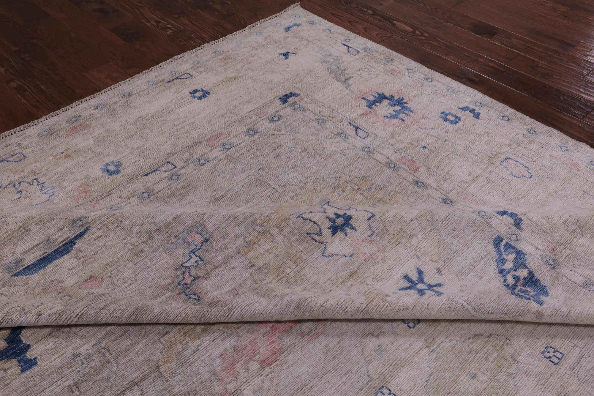 Oushak Rugs are distinctive in both pattern and color palette. Most have a blue, green, dark ivory, or gold & their designs are typically based on geometric motifs and vine / leave motifs. All colors are created with natural vegetable dyes, and the hushed tones are enhanced by the soft, lustrous wool texture. The foundation of an Oushak is cotton while the pile is wool. Oushak rugs are also double-knotted for durability.